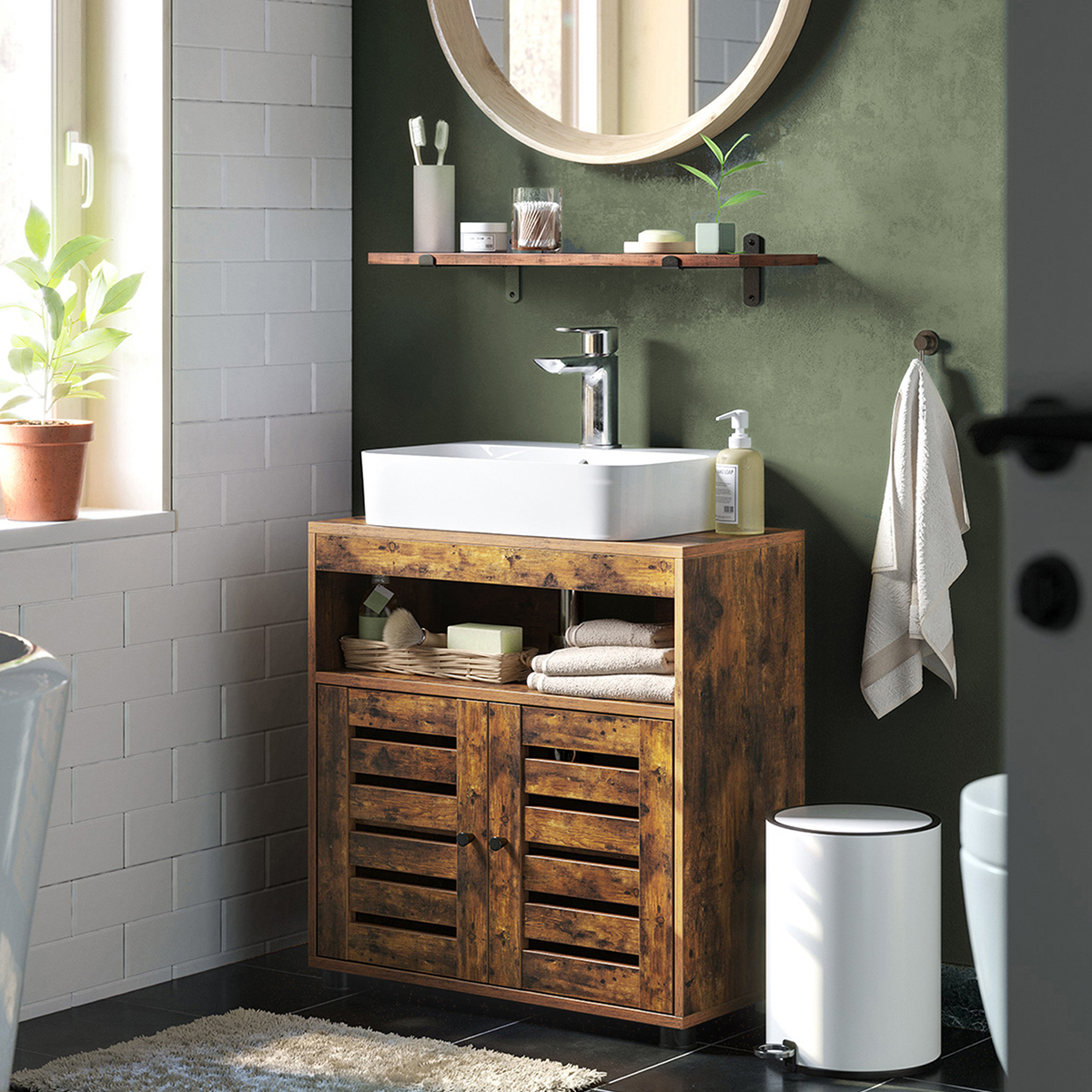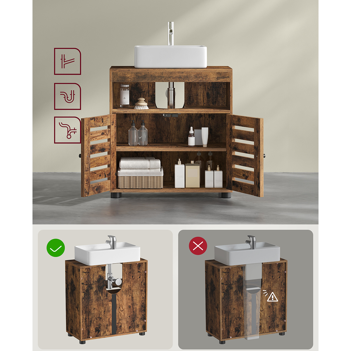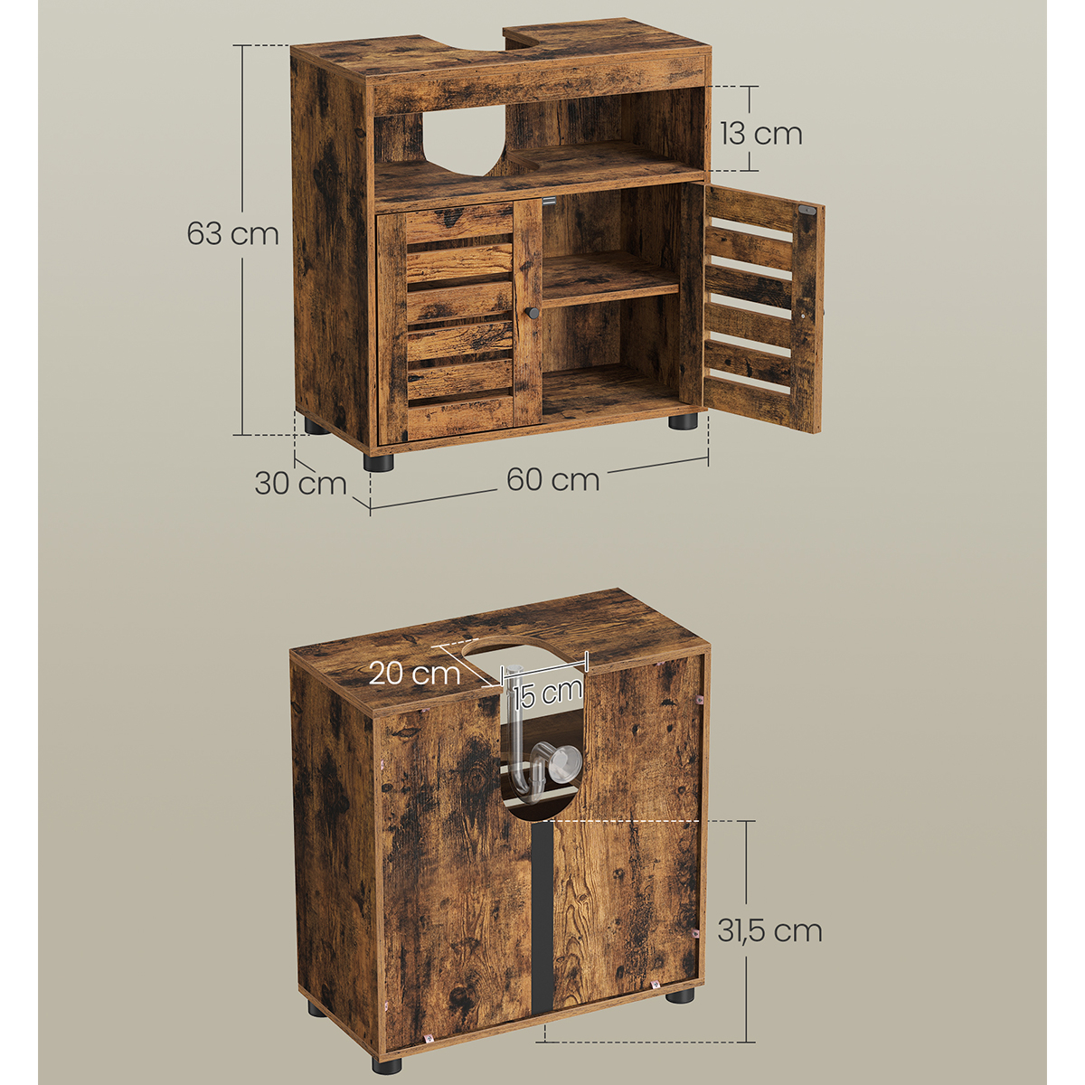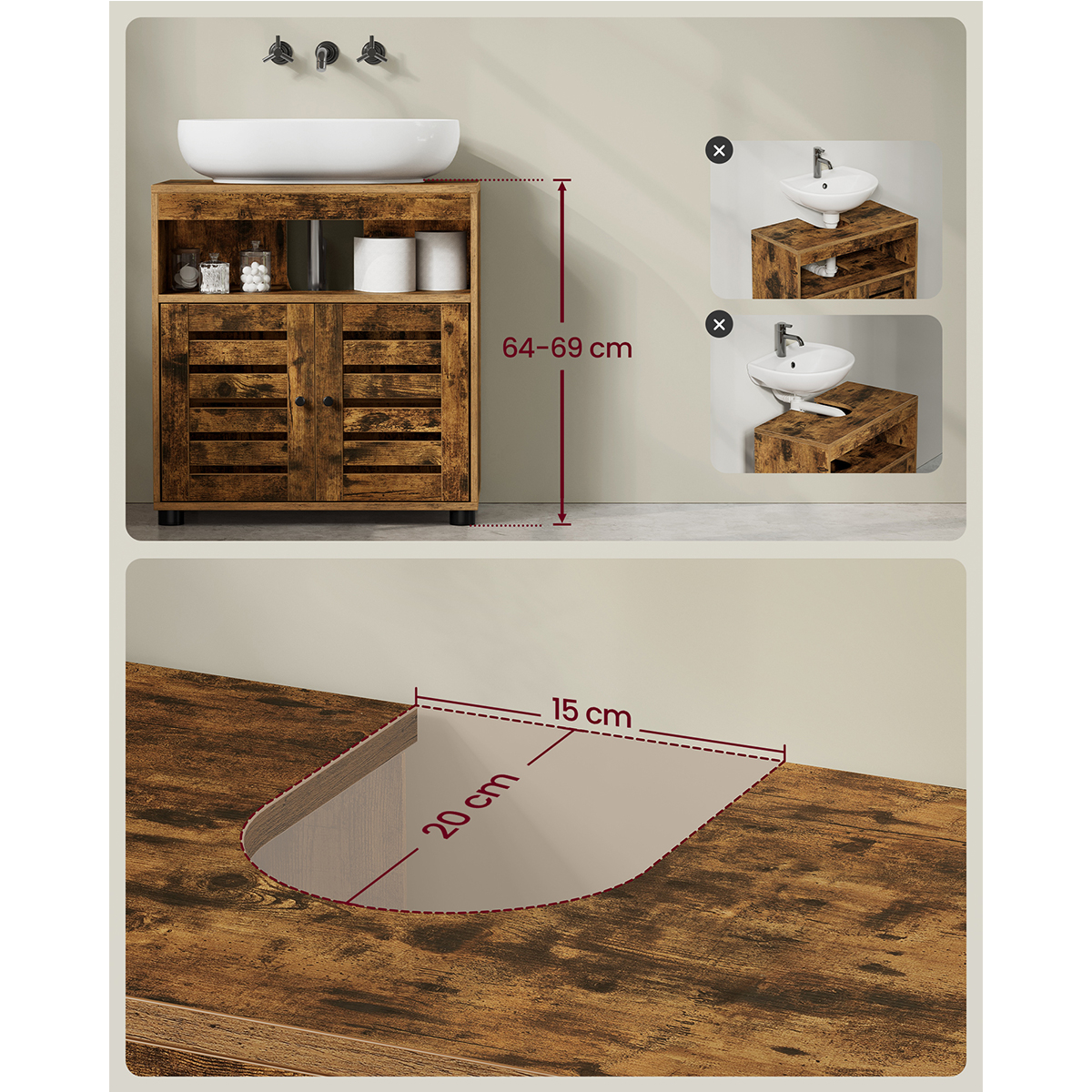 Ντουλάπι μπάνιου για τον χώρο κάτω από τον νιπτήρα από την εταιρεία Vasagle. Είναι κατασκευασμένο από μοριοσανίδα σε καφέ ρουστίκ χρώμα. Διαθέτει κενό στο πάνω μέρος για να μπορεί να τοποθετηθεί ο νιπτήρας. Έχει λαβές για να ανοίγετε το ντουλάπι και 1 ράφι για να τακτοποιείτε τα πράγματα σας. Εσωτερικά διαθέτει 1 ράφι για να χωρίζει τον χώρο σε 2 μέρη. Διαθέτει εξαρτήματα εγκατάστασης τοίχου για αποφυγή ανατροπής και μέγιστη σταθερότητα. Μέγιστο βάρος αντοχής επάνω επιφάνειας 20kg. *Το προϊόν έρχεται αμοντάριστο και συναρμολογείται βάσει οδηγιών.*