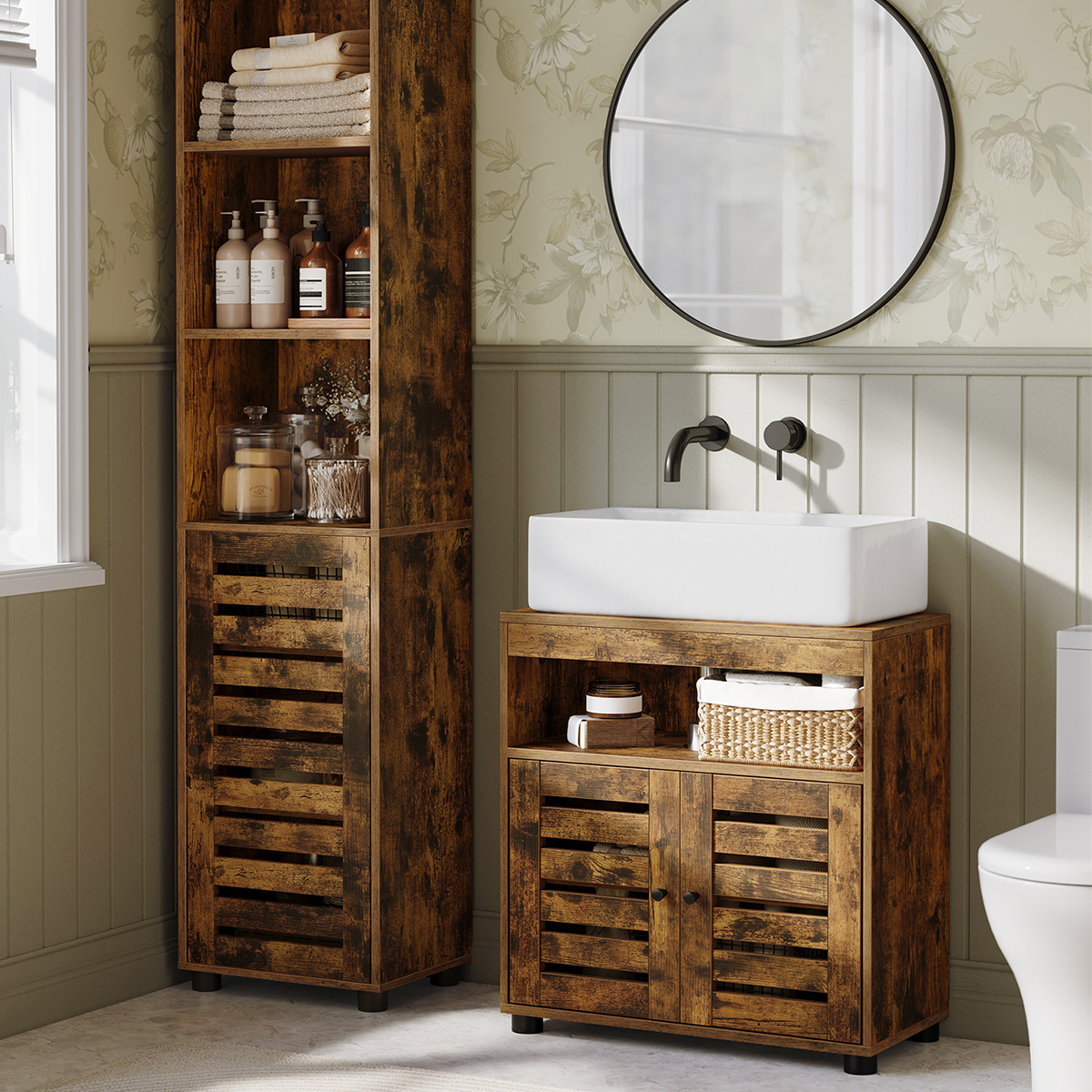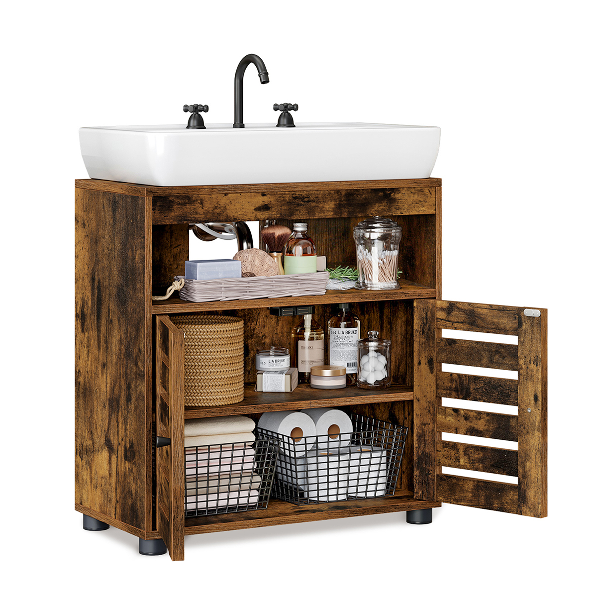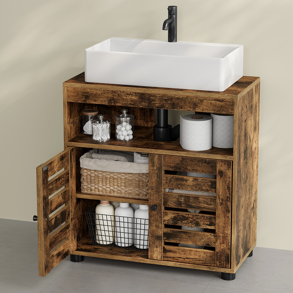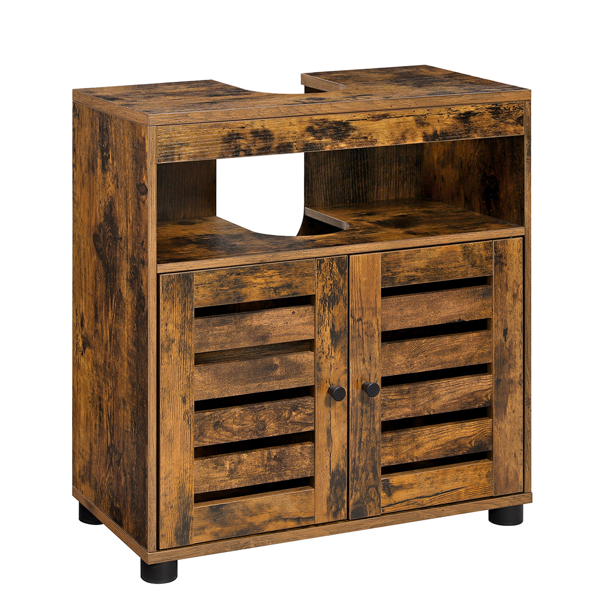 Ντουλάπι μπάνιου για τον χώρο κάτω από τον νιπτήρα από την εταιρεία Vasagle. Είναι κατασκευασμένο από μοριοσανίδα σε καφέ ρουστίκ χρώμα. Διαθέτει κενό στο πάνω μέρος για να μπορεί να τοποθετηθεί ο νιπτήρας. Έχει λαβές για να ανοίγετε το ντουλάπι και 1 ράφι για να τακτοποιείτε τα πράγματα σας. Εσωτερικά διαθέτει 1 ράφι για να χωρίζει τον χώρο σε 2 μέρη. Διαθέτει εξαρτήματα εγκατάστασης τοίχου για αποφυγή ανατροπής και μέγιστη σταθερότητα. Μέγιστο βάρος αντοχής επάνω επιφάνειας 20kg. *Το προϊόν έρχεται αμοντάριστο και συναρμολογείται βάσει οδηγιών.*