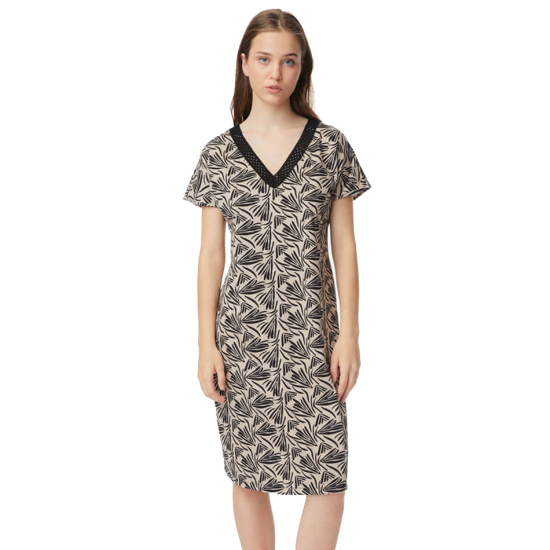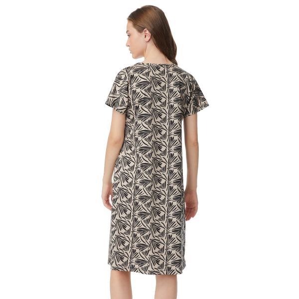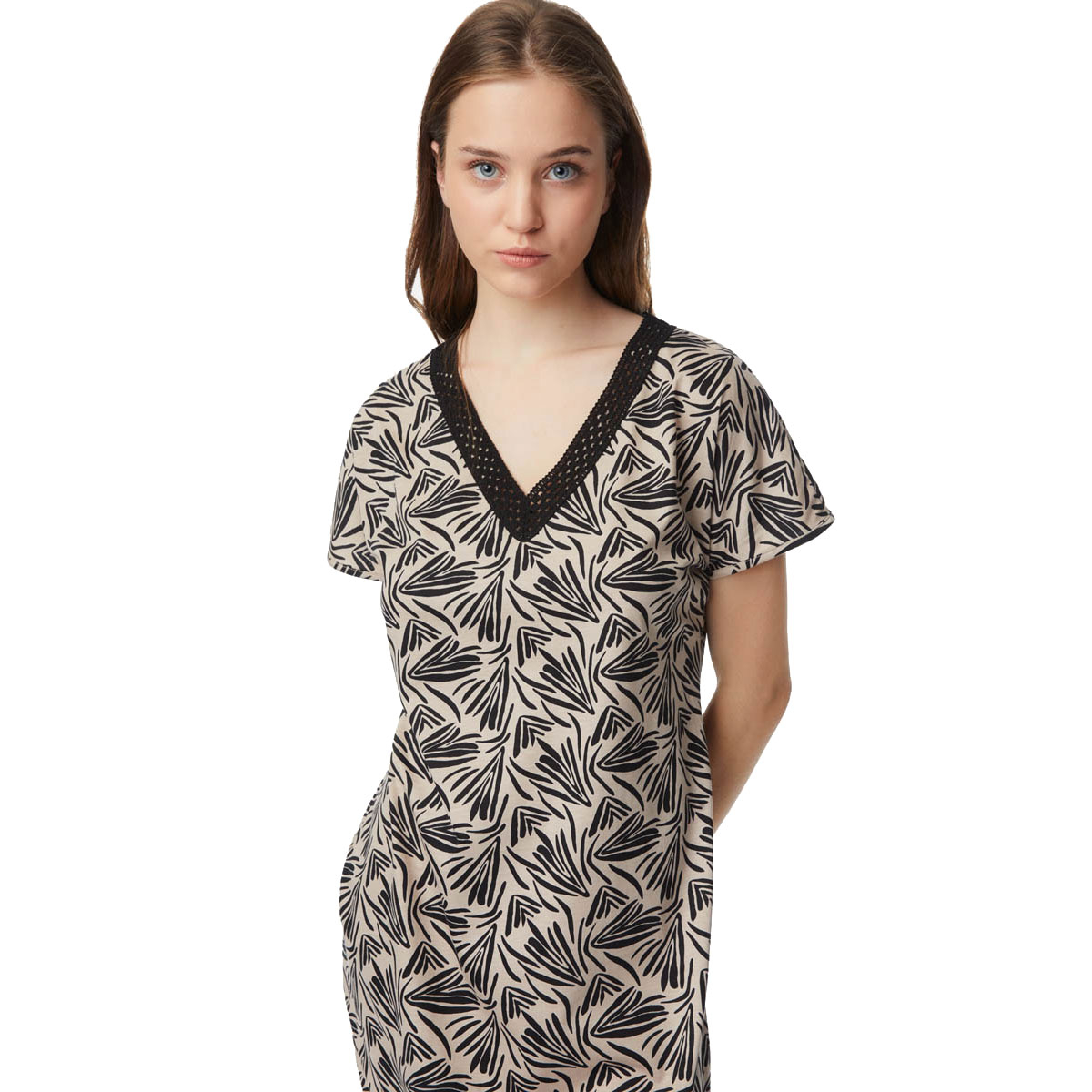 Γυναικείο νυχτικό από την εταιρεία Minerva σε μπεζ χρώμα με μαύρες λεπτομέρειες και μοντέρνο σχέδιο. Είναι κοντομάνικο με V λαιμόκοψη και λεπτομέρειες από δαντέλα. Το ύφασμα είναι κατασκευασμένο από 100% βαμβάκι, που προσδίδει ιδιαίτερη απαλότητα, αντοχή και σωστή εφαρμογή. Είναι ιδιαίτερα ανθεκτικό και διατηρεί τη φόρμα του. Τα χρώματα έχουν δημιουργηθεί με την μέθοδο της νηματοβαφής (μέσα στην ύφανση), με αποτέλεσμα να παραμένουν αναλλοίωτα στην χρήση και τις πλύσεις. Τα προϊόντα Minerva διαθέτουν τα διεθνή πιστοποιητικά ποιότητας και ασφάλειας ISO 9001:2000 , ISO 9002, Oeko-Tex Standard 100, Eco Textile Label. Σε όλα τα στάδια παραγωγής έχουν χρησιμοποιηθεί υποαλλεργικά υλικά χωρίς επιβλαβείς ουσίες προς την υγεία. Αποτελούν προϊόντα ελληνικής ραφής με την εγγύηση ποιότητας και αξιοπιστίας της εταιρείας Minerva.