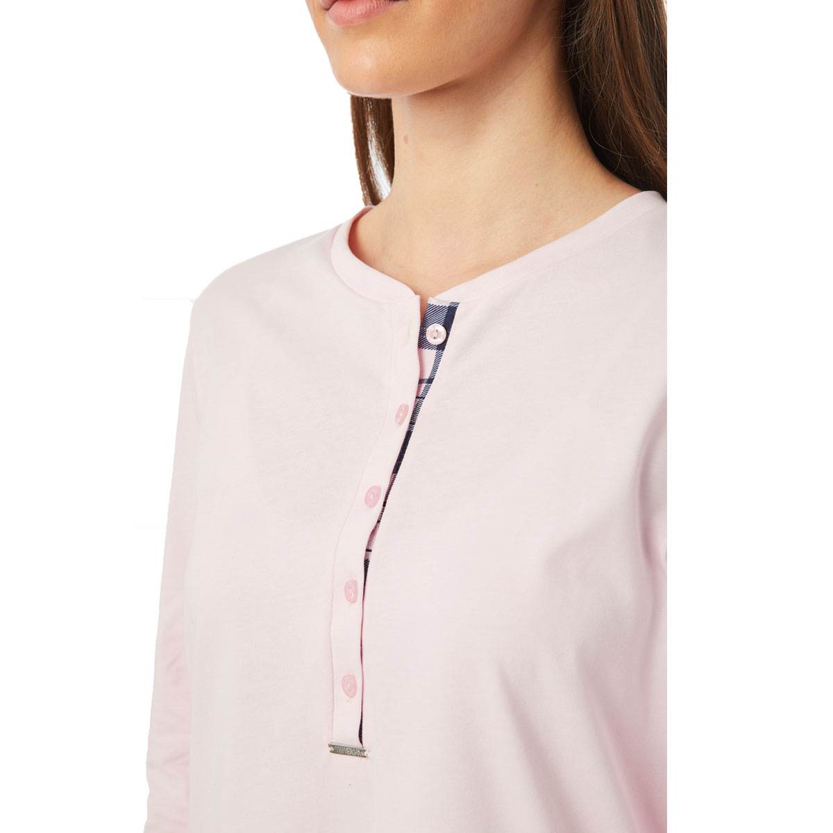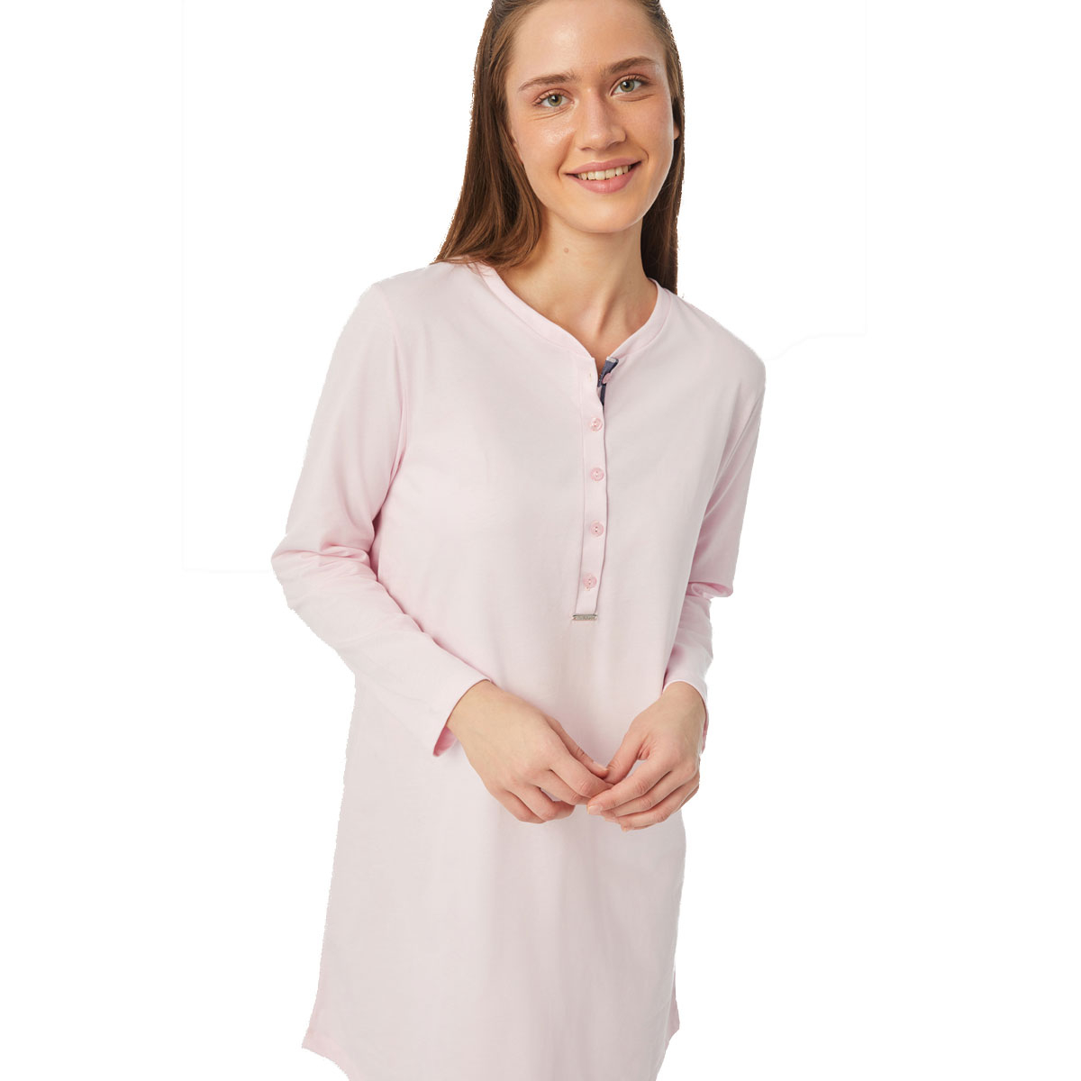 Γυναικείο νυχτικό από την εταιρεία Minerva σε ροζ χρώμα. Πρόκειται για μακρυμάνικο νυχτικό που τελειώνει λίγο πιο πάνω από το γόνατο. Έχει στρογγυλή λαιμόκοψη με πατιλέτα με κουμπιά που τη καθιστά ιδανική για θηλασμό. Είναι κατασκευασμένο από 100% βαμβακερό ύφασμα εξαιρετικής ποιότητας, που προσδίδει ιδιαίτερη απαλότητα, αντοχή και σωστή εφαρμογή. Είναι ιδιαίτερα ανθεκτικό και διατηρεί τη φόρμα του. Τα χρώματα έχουν δημιουργηθεί με την μέθοδο της νηματοβαφής (μέσα στην ύφανση), με αποτέλεσμα να παραμένουν αναλλοίωτα στην χρήση και τις πλύσεις. Τα προϊόντα Minerva διαθέτουν τα διεθνή πιστοποιητικά ποιότητας και ασφάλειας ISO 9001:2000 , ISO 9002, Oeko-Tex Standard 100, Eco Textile Label. Σε όλα τα στάδια παραγωγής έχουν χρησιμοποιηθεί υποαλλεργικά υλικά χωρίς επιβλαβείς ουσίες προς την υγεία. Αποτελούν προϊόντα ελληνικής ραφής με την εγγύηση ποιότητας και αξιοπιστίας της εταιρείας Minerva.