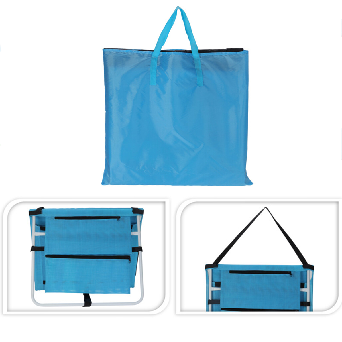 Πτυσσόμενη ξαπλώστρα παραλίας σε γαλάζιο χρώμα. Το ύφασμα του είναι κατασκευασμένο από 100% polyester και η γέμιση είναι από αφρό πολυουρεθάνης. Ο σκελετός είναι μεταλλικός σε λευκό χρώμα με διατομή σωλήνα Φ1.5εκ. Διαθέτει μαύρο ρυθμιζόμενο ιμάντα μεταφοράς με λουράκι ώμου και velcro. Στο πίσω μέρος διαθέτει 2 θήκες με φερμουάρ. Καθώς είναι πτυσσόμενη, μεταφέρεται εύκολα και καταλαμβάνει λιγότερο χώρο. Ιδανικό στρώμα αντί για ψάθα στην παραλία.