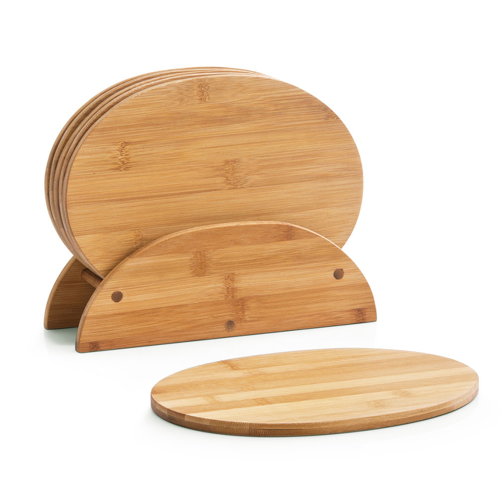 Οβάλ ξύλα κοπής σε σετ με βάση, κατασκευασμένα από ξύλο ακακίας σε μπεζ χρώμα. Το σετ περιλαμβάνει 6 επιφάνειες κοπής και 1 βάση για να τις έχετε πάντα τακτοποιημένες. Ιδανικές για να κόβετε οποιαδήποτε τροφή χρειάζεστε χωρίς να αφήνετε χαρακιές στους πάγκους της κουζίνας σας. *Λόγω της φυσικής του κατάστασης είναι πιθανό να παρουσιάσει μικρές διαφορές στο χρώμα.*
