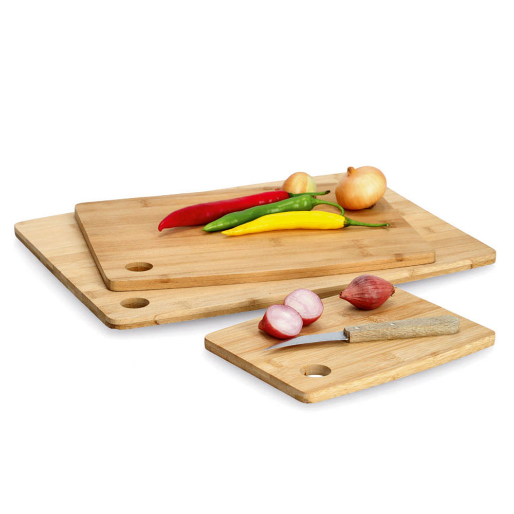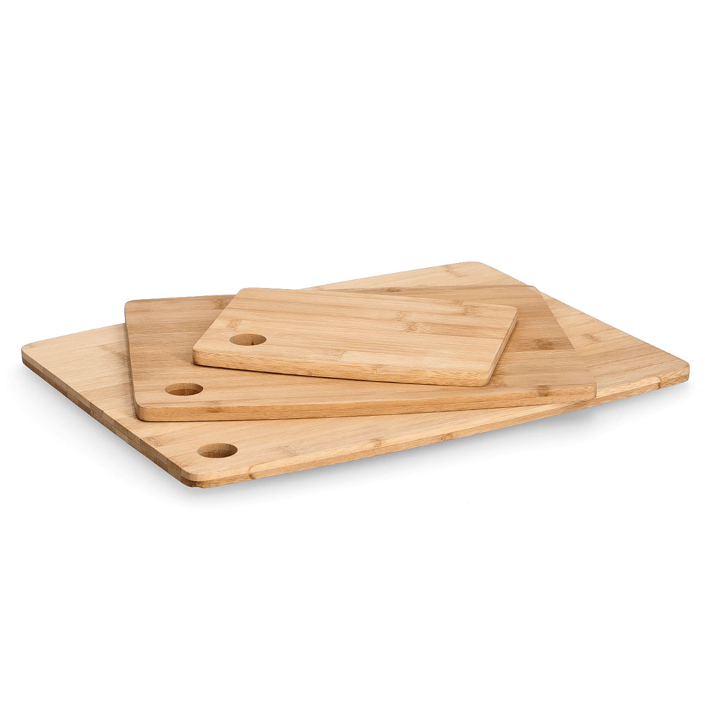 Ξύλα κοπής σε σετ, κατασκευασμένα από ξύλο bamboo σε μπεζ χρώμα. Το σετ περιλαμβάνει 3 επιφάνειες κοπής διαφορετικών μεγεθών. Ιδανικά για να κόβετε οποιαδήποτε τροφή χρειάζεστε χωρίς να αφήνετε χαρακιές στους πάγκους της κουζίνας σας. Διαθέτουν τρύπες για να κρεμιούνται. Με πιστοποίηση FSC 100% SCS-COC-000256. *Λόγω της φυσικής του κατάστασης είναι πιθανό να παρουσιάσει μικρές διαφορές στο χρώμα.*
