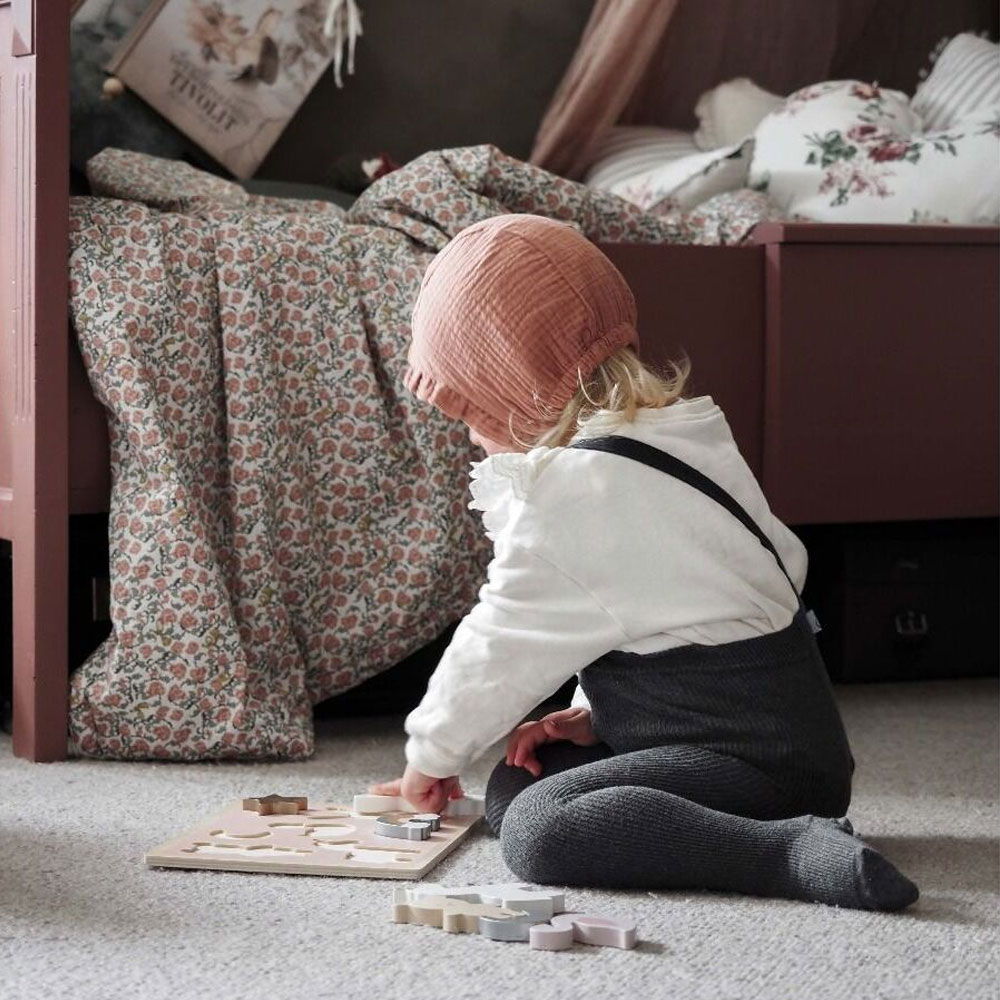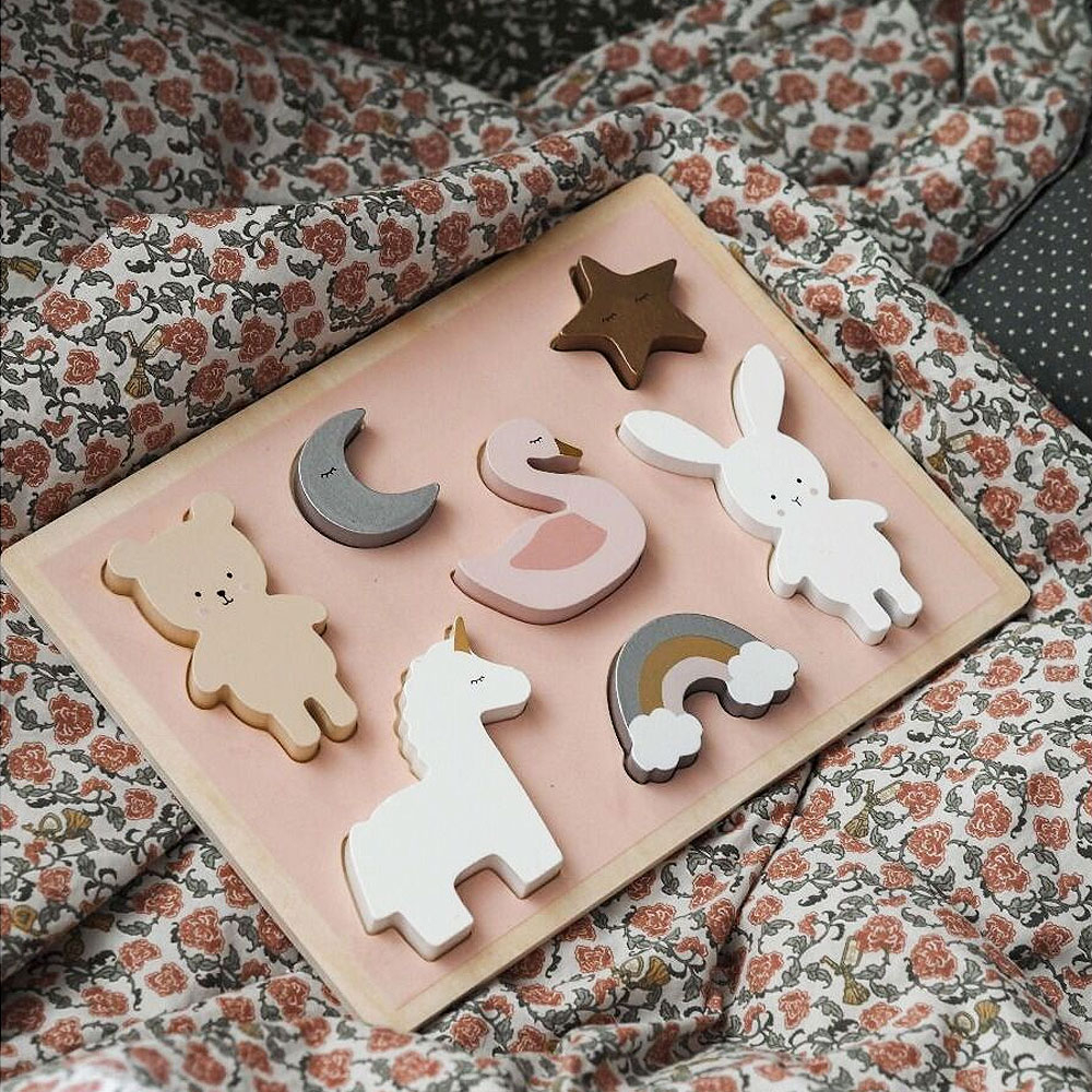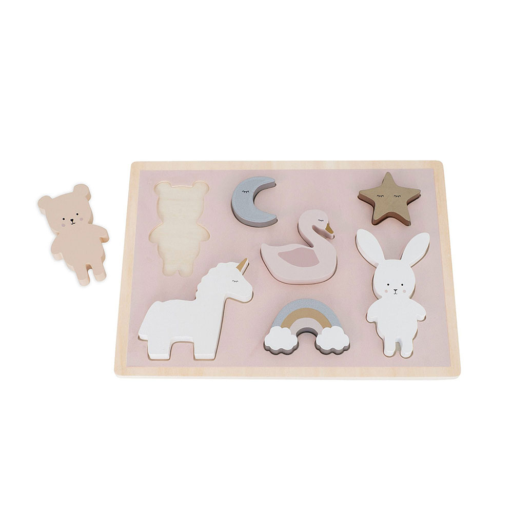Ξύλινο πάζλ της σουηδικής εταιρείας Jabadabado σε ροζ χρώμα με πολύχρωμες λεπτομέρειες. Καλλιεργεί την φαντασία του παιδιού και αναπτύσσει την παρατηρητικότητα και τις κινητικές του δεξιότητες. Έχει 7 διαφορετικά σφηνώματα που έχουν το ιδανικό μέγεθος για τα μικρά του χεράκια και του μαθαίνουν τα ζωάκια. Κατάλληλο για ηλικίες 18+ μηνών.