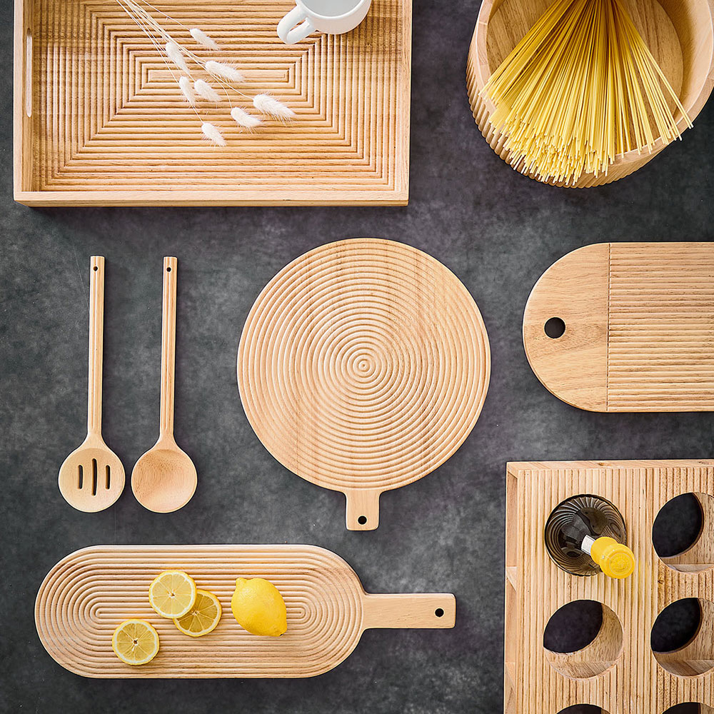 Ορθογώνιο ξύλο κοπής, κατασκευασμένο από ξύλο καουτσούκ. Έχει μπεζ χρώμα και ριγέ αυλακωτό σχέδιο. Απαλό στα μαχαίρια και ανθεκτικό στην κοπή. Ιδανικό για να κόβετε οποιαδήποτε τροφή χρειάζεστε χωρίς να αφήνετε χαρακιές στους πάγκους της κουζίνας σας. Διαθέτει τρύπα για να κρεμιέται. Με πιστοποίηση FSC 100% SCS-COC-000256. *Λόγω της φυσικής του κατάστασης είναι πιθανό να παρουσιάσει μικρές διαφορές στο χρώμα.* Συνδυάστε το με τα υπόλοιπα είδη του ίδιου σετ για ένα ολοκληρωμένο αποτέλεσμα στο χώρο σας.