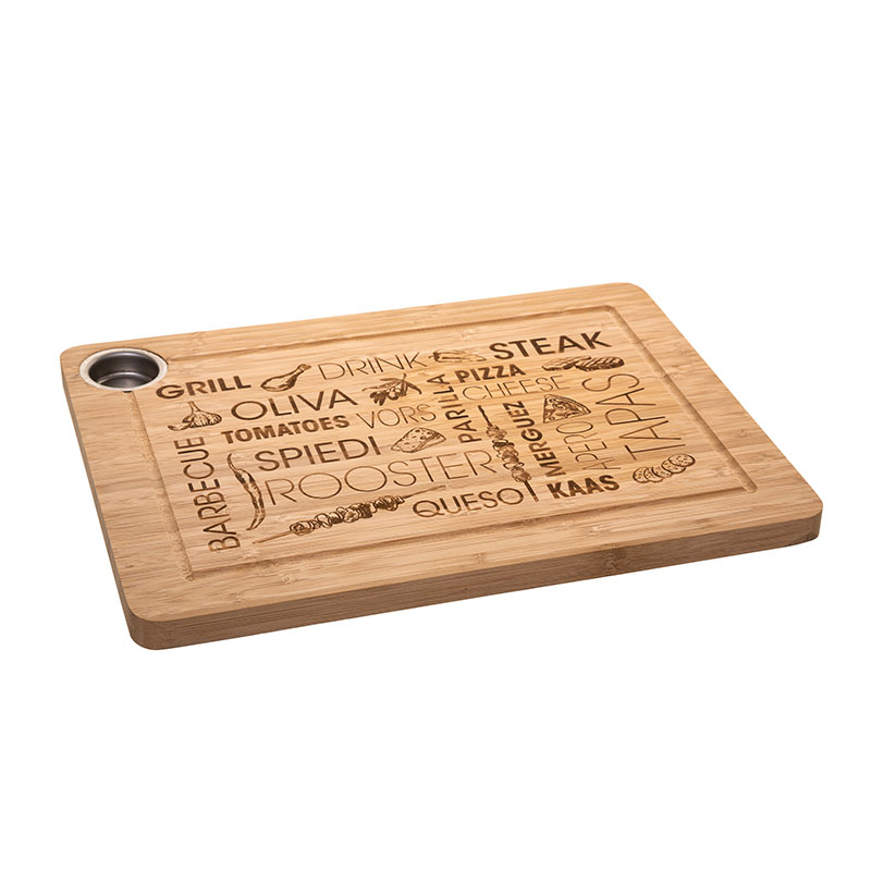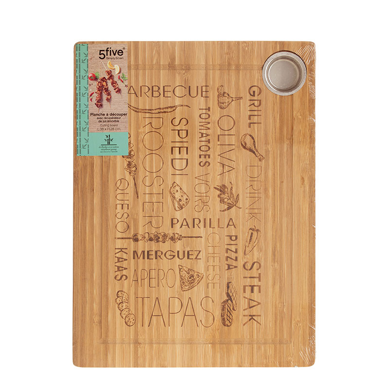 Ξύλο κοπής κατασκευασμένο από ξύλο bamboo σε μπεζ χρώμα με ανάγλυφο σχέδιο. Διαθέτει κανάλι περισυλλογής των χυμών ώστε να μην λερώνετε τον πάγκο σας και τρύπα για να κρεμιέται. Ιδανικό εργαλείο για να τεμαχίζετε τις τροφές χωρίς να αφήνετε χαρακιές στη κουζίνα σας. Σε αντίθεση με το παραδοσιακό ξύλο, το μπαμπού είναι πιο ανθεκτικό στα σημάδια των μαχαιριών και στο νερό. Για να διατηρήσετε την ποιότητα της σανίδας σας, καλό είναι να την αλείψετε με λίγο φυτικό λάδι.