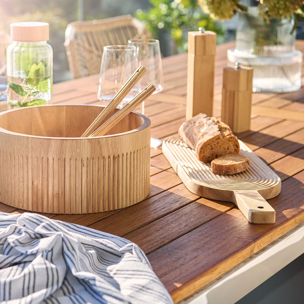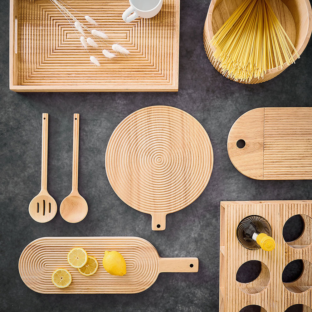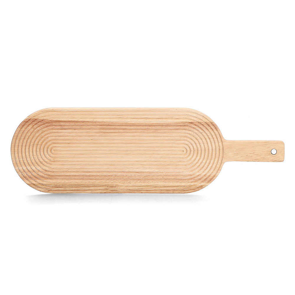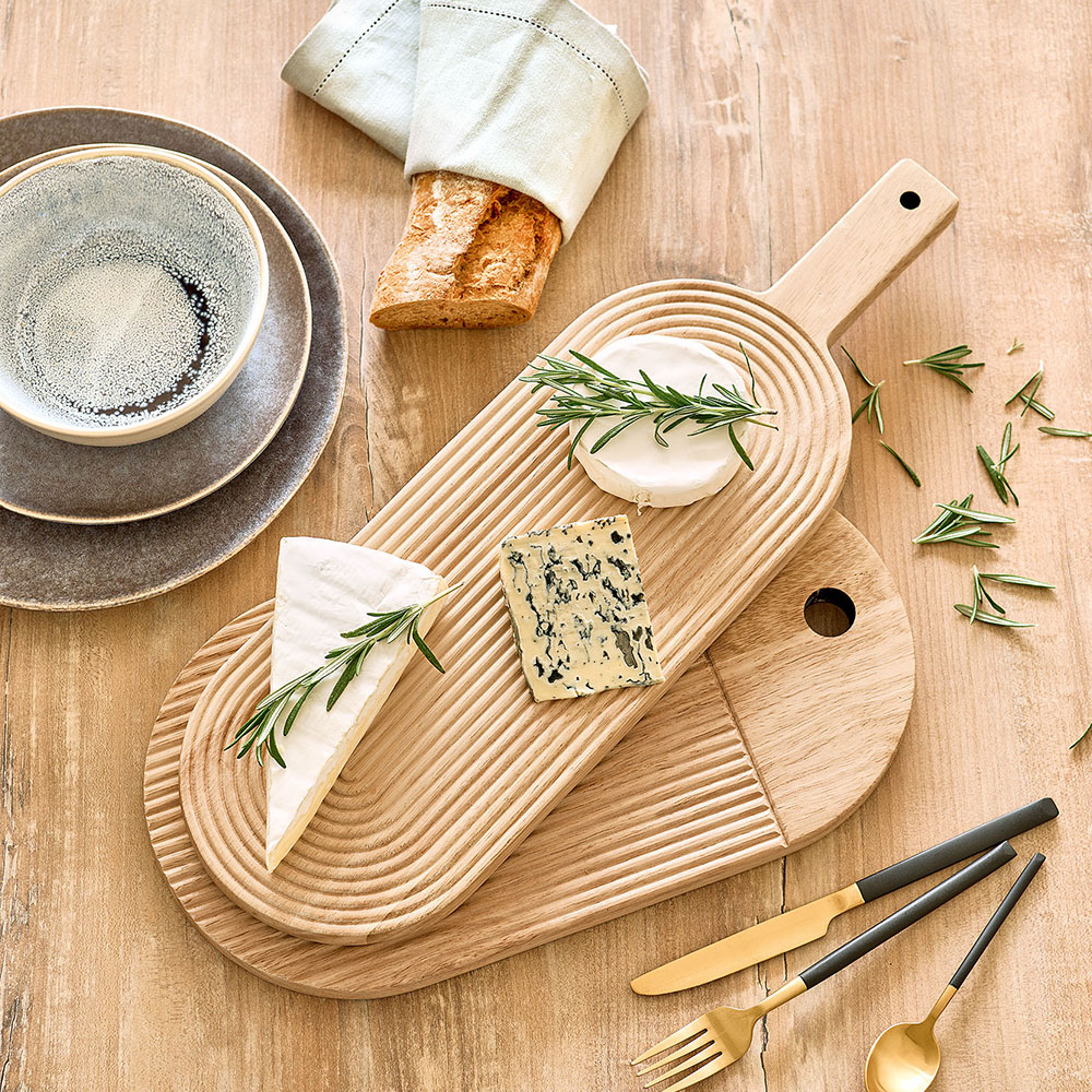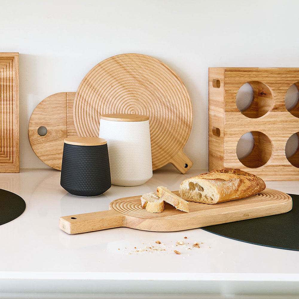 Ορθογώνιο ξύλο κοπής, κατασκευασμένο από ξύλο καουτσούκ. Έχει μπεζ χρώμα και ριγέ αυλακωτό σχέδιο. Απαλό στα μαχαίρια και ανθεκτικό στην κοπή. Ιδανικό για να κόβετε οποιαδήποτε τροφή χρειάζεστε χωρίς να αφήνετε χαρακιές στους πάγκους της κουζίνας σας. Διαθέτει λαβή μεταφοράς και τρύπα για να κρεμιέται. Με πιστοποίηση FSC 100% SCS-COC-000256. *Λόγω της φυσικής του κατάστασης είναι πιθανό να παρουσιάσει μικρές διαφορές στο χρώμα.* Συνδυάστε το με τα υπόλοιπα είδη του ίδιου σετ για ένα ολοκληρωμένο αποτέλεσμα στο χώρο σας.