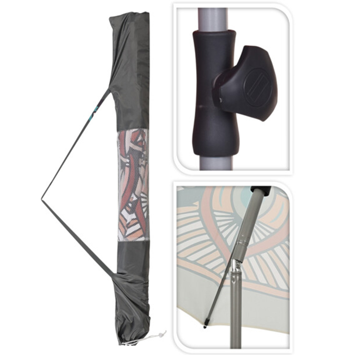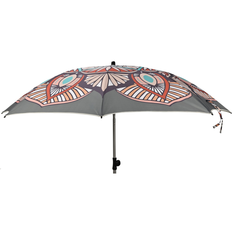 Ομπρέλα θαλάσσης με διάμετρο 2 μέτρα σε μπεζ-γκρι χρώμα με έθνικ σχέδιο. Έχει 8 ακτίνες και άξονα από μεταλλικό υλικό. Το ύφασμά της είναι από 100% polyester και έχει δείκτη προστασίας UPF 50+ που σας κρατάει ασφαλείς από την επιβλαβή ηλιακή ακτινοβολία. Έχει ρυθμιζόμενο ύψος για να προσαρμόζεται στις ανάγκες σας και θήκη μεταφοράς. Μπορεί να πάρει κλίση για καλύτερη προστασία και σκιά. Ιδανική για να χαρείτε το μπάνιο σας στην παραλία. Η ομπρέλα δεν έχει αυτόματο μηχανισμό ανοίγματος. Δεν περιλαμβάνεται βάση.