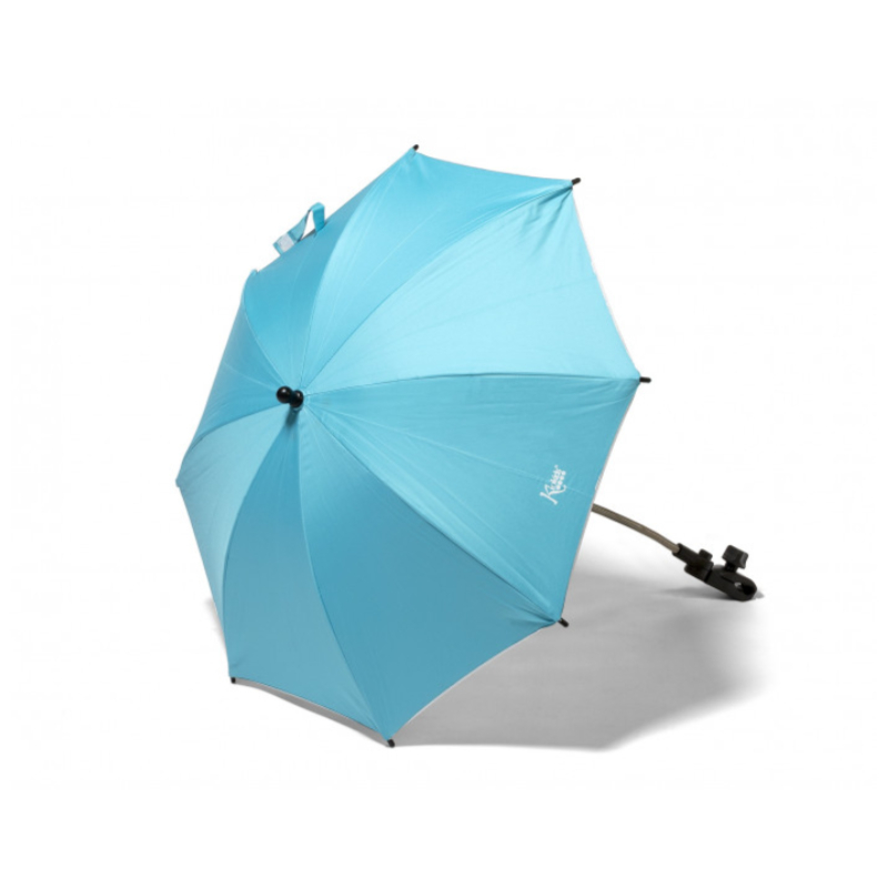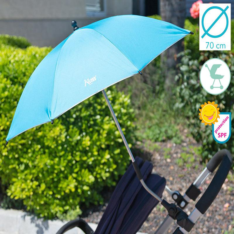 Ομπρέλα για το καρότσι από την εταιρεία Kiokids σε γαλάζιο χρώμα. Έχει μεταλλικό βραχίονα που εφαρμόζει σε όλα τα καρότσια. Το ύφασμά της προστατεύει το μωρό από την ηλιακή ακτινοβολία ώστε να απολαμβάνετε την βόλτα με το μωρό σας με ασφάλεια. Εφαρμόζει στο καρότσι με σφιγκτήρα κατάλληλο για στρογγυλούς και τετράγωνους σωλήνες, ο οποίος μένει σταθερά προσαρτημένος στο καρότσι. Το πάνω μέρος με την ομπρέλα αφαιρείται και επανατοποθετείται εύκολα όποτε επιθυμείτε.