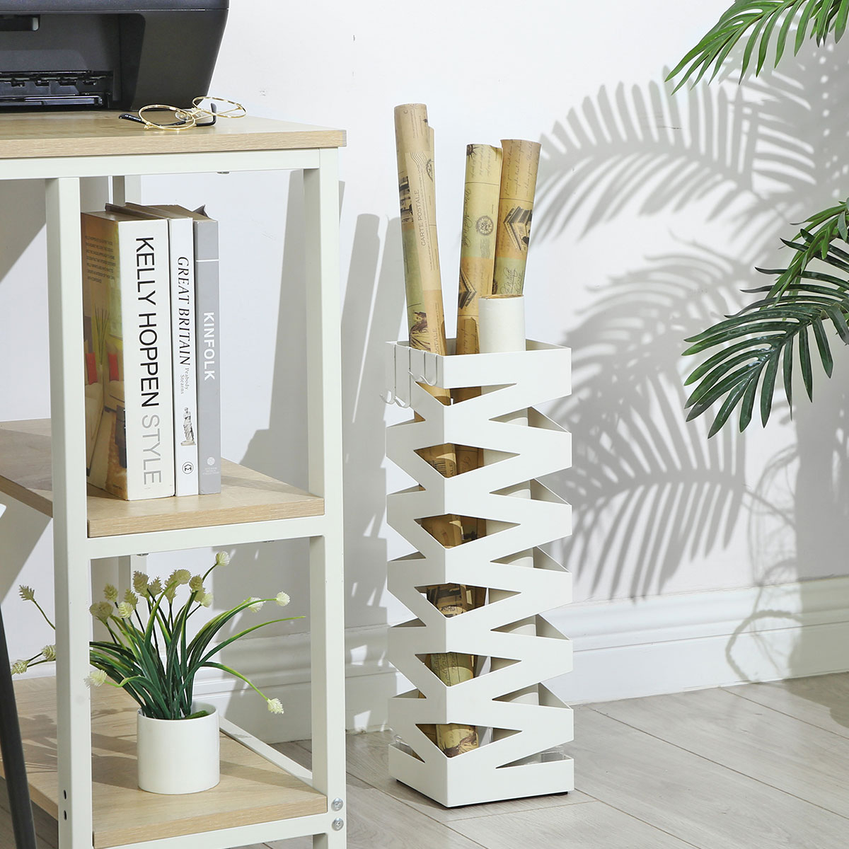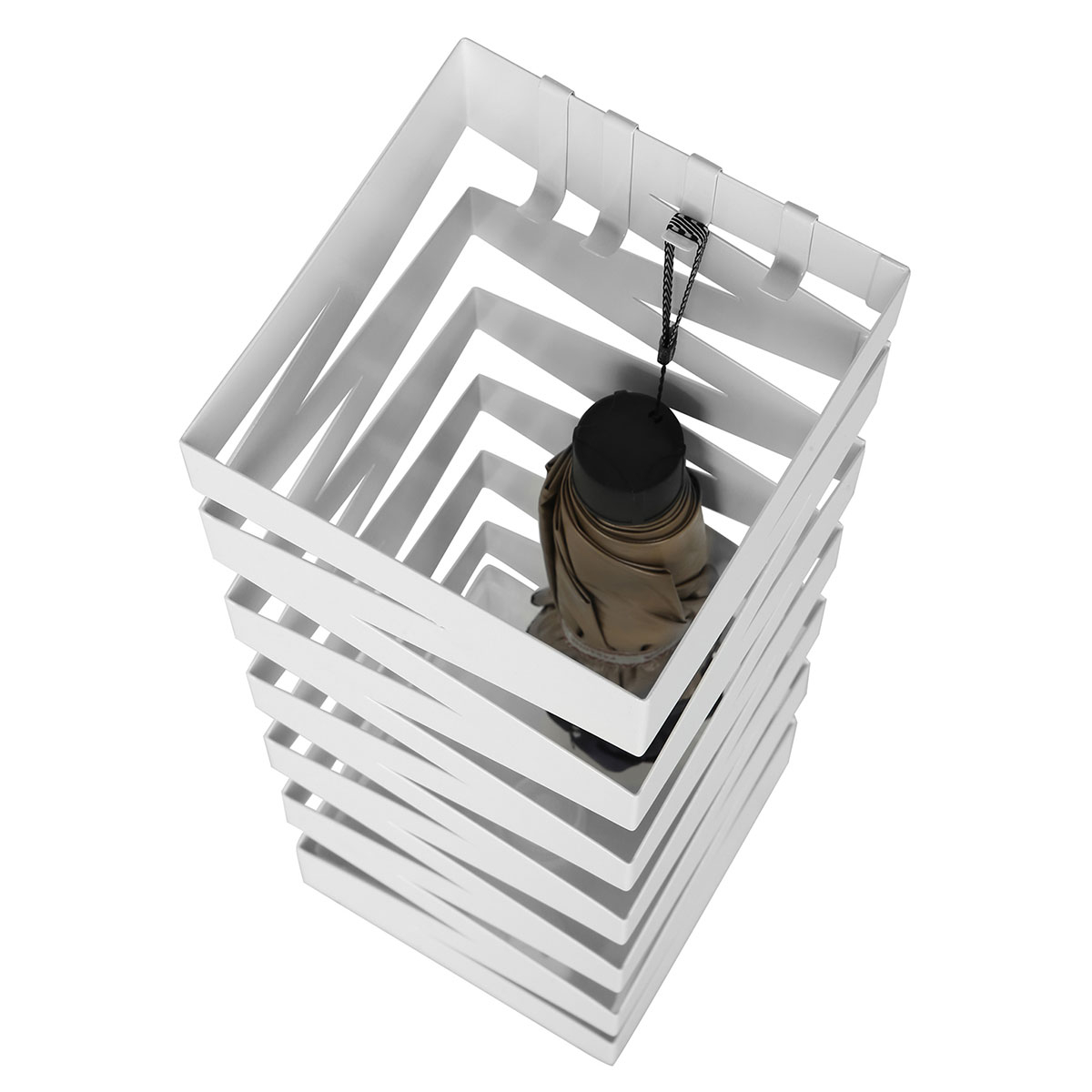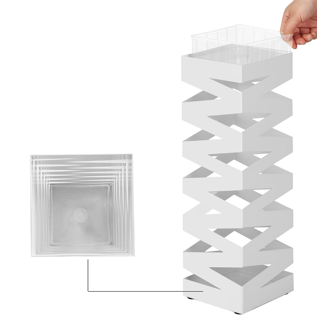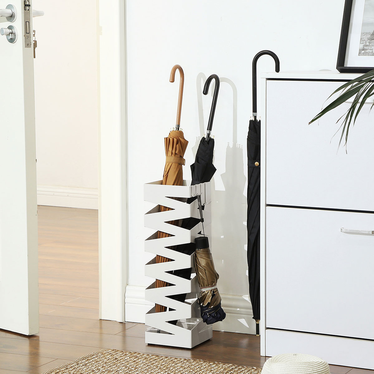 Ομπρελοθήκη με μοντέρνο σχεδιασμό από την εταιρεία Songmics. Είναι κατασκευασμένη από μεταλλικό υλικό σε λευκό χρώμα και έχει αφαιρούμενο πλαστικό δοχείο για να μην καταστρέφεται το δάπεδο από τα νερά. Από την κάτω μεριά έχει τάπες για αποφυγή γρατζουνιών. Διαθέτει 2 μικρά και 2 μεγαλύτερα γαντζάκια για να κρεμάτε τις ομπρέλες. Ιδανική ομπρελοθήκη που θα ταιριάξει σε κάθε σύγχρονο σπίτι.