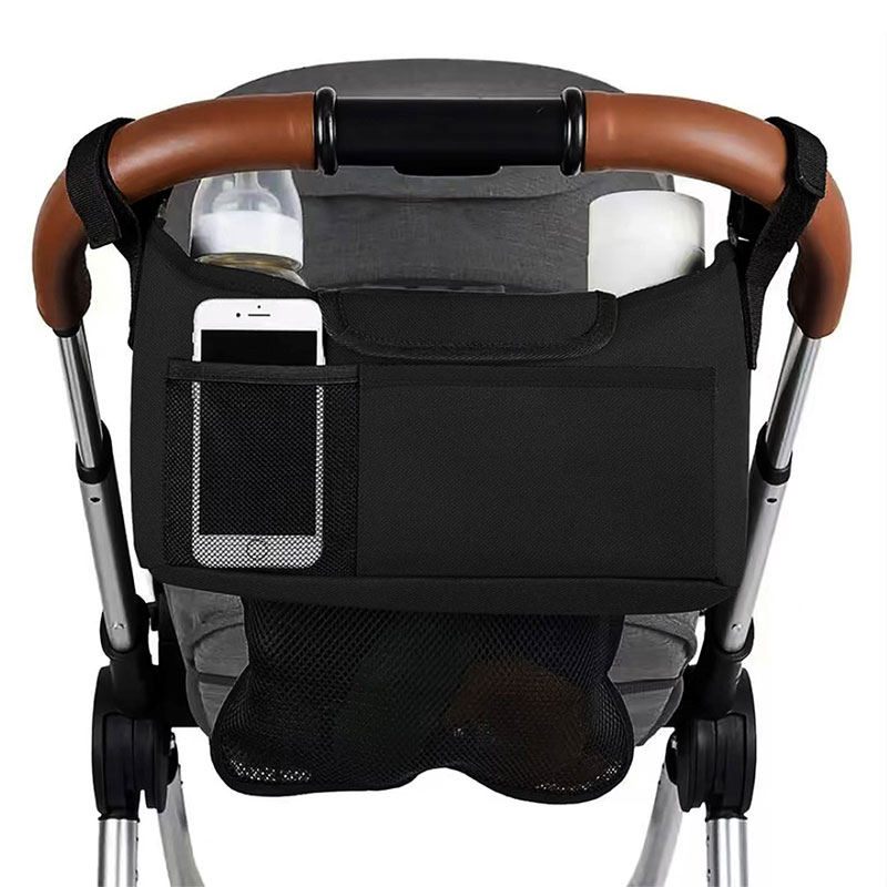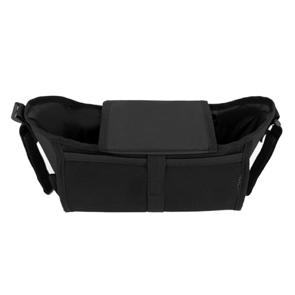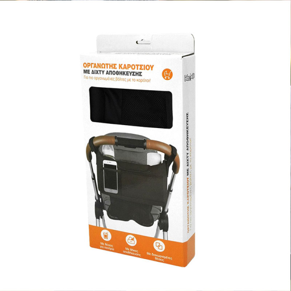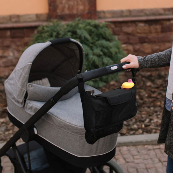 Organizer καροτσιού από την εταιρεία Babywise σε μαύρο χρώμα. Έχει μία μεγάλη θήκη για όλα τα απαραίτητα πράγματα του μωρού. Επίσης, έχει 2 θήκες για μπουκάλια και ποτήρια. Διαθέτει ενσωματωμένο διχτάκι για τα βρεγμένα ρούχα. Εξωτερικά έχει 2 θήκες. Ταιριάζει σε όλα τα καρότσια είτε έχουν μπάρα είτε χερούλια. Κομψή και ιδανική για τις βόλτες με το μωρό σας.
