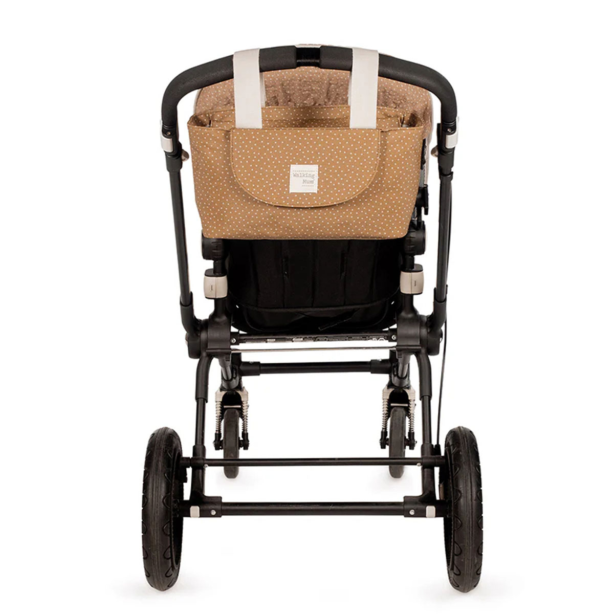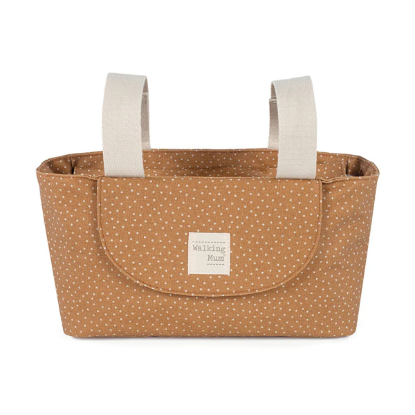 Organizer καροτσιού από την εταιρεία Walking Mum στο χρώμα της ώχρας, με εκρού λεπτομέρειες και πουά σχέδιο. Είναι κατασκευασμένο από 100% πλαστικοποιημένο βαμβάκι που έχει υποστεί ειδική επεξεργασία ώστε να είναι αδιάβροχο. Η Walking Mum προστατεύει το μωρό σας χρησιμοποιώντας τα καλύτερα υφάσματα, απαλλαγμένα από ζαχαρώματα και ουσίες που είναι επιβλαβείς για την υγεία. Αποτελείται από μία κύρια θήκη που κλείνει με φερμουάρ. Διαθέτει θήκες εσωτερικά της κύριας που είναι ιδανικές για μικροαντικείμενα. Μπροστά έχει μια διακριτική θήκη που μπορείτε να βάζετε τα υγρά μαντηλάκια του μωρού σας ή ότι άλλο θέλετε να έχετε άμεση πρόσβαση. Εφαρμόζει εύκολα στις λαβές του καροτσιού και χάρη στο μεγάλο άνοιγμά του, σας προσφέρει άμεση πρόσβαση στα πράγματά σας. Είναι ιδανικό για να τοποθετήσετε τα απαραίτητα είδη για την βόλτα με το μωρό σας.