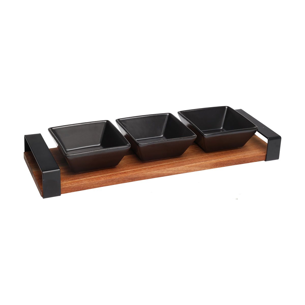 Ορντεβιέρα σερβιρίσματος 3 θέσεων για να σερβίρετε ορεκτικά, σάλτσες ή οτιδήποτε άλλο επιθυμείτε. Διαθέτει 3 μπωλ κατασκευασμένα από κεραμικό υλικό σε μαύρο χρώμα με βάση είναι από ξύλο ακακίας σε φυσικό χρώμα με μαύρες μεταλλικές λαβές. Ο συνδυασμός κεραμικού και ξύλου προσδίδει φυσική και κομψή αισθητική. Μια πρακτική και καλαίσθητη προσθήκη για κάθε γεύμα.