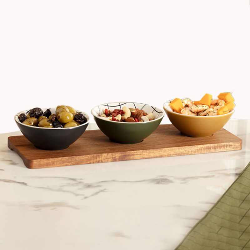 Ορντεβιέρα σερβιρίσματος με μοντέρνο σχεδιασμό. Το σετ περιλαμβάνει 1 δίσκο κατασκευασμένο από ξύλο ακακίας σε καφέ χρώμα και 3 κεραμικά μπωλάκια με καρό σχέδιο. Μπορεί να χρησιμοποιηθεί σαν δίσκος σερβιρίσματος - ορντεβιέρα για να σερβίρετε ξηρούς καρπούς ή ότι άλλο θέλετε για την τραπεζαρία, το τραπεζάκι σαλονιού ή τον μπουφέ.