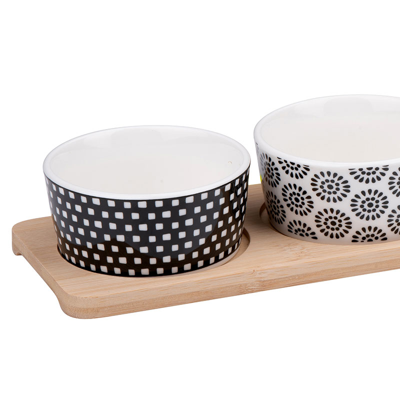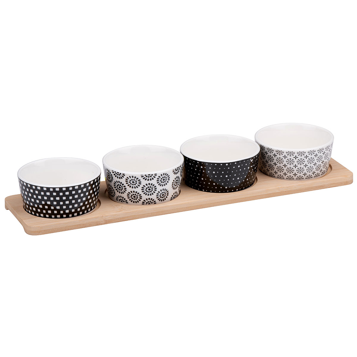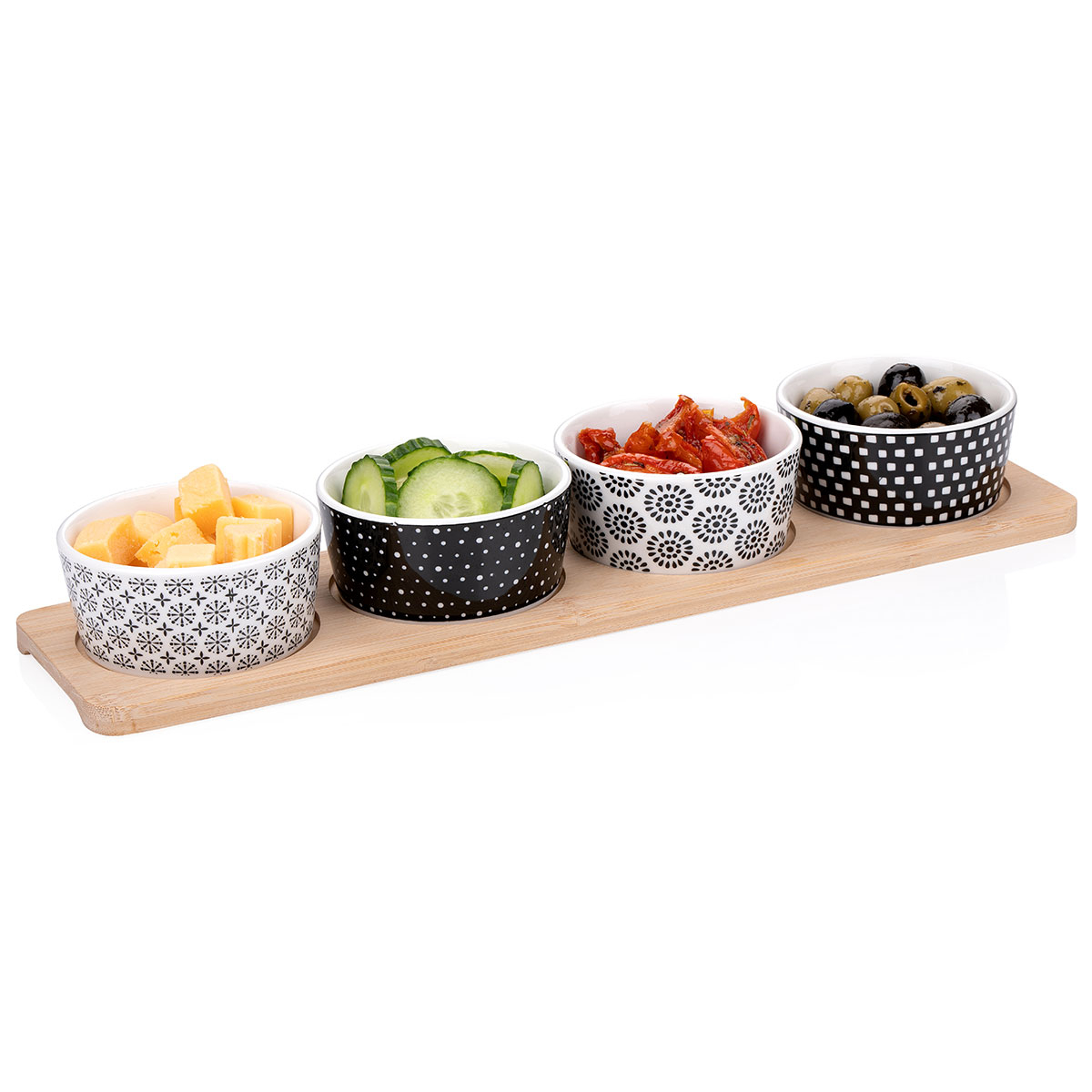 Ορντεβιέρα σερβιρίσματος με 4 μπωλάκια. Το πλατώ είναι κατασκευασμένο από ξύλο bamboo σε μπεζ χρώμα. Τα μπολάκια είναι κεραμικά σε λευκό και μαύρο χρώμα με μοντέρνο σχέδιο. Μπορεί να χρησιμοποιηθεί σαν δίσκος σερβιρίσματος - ορντεβιέρα για να σερβίρετε ξηρούς καρπούς ή ότι άλλο θέλετε για την τραπεζαρία, το τραπεζάκι σαλονιού ή τον μπουφέ.