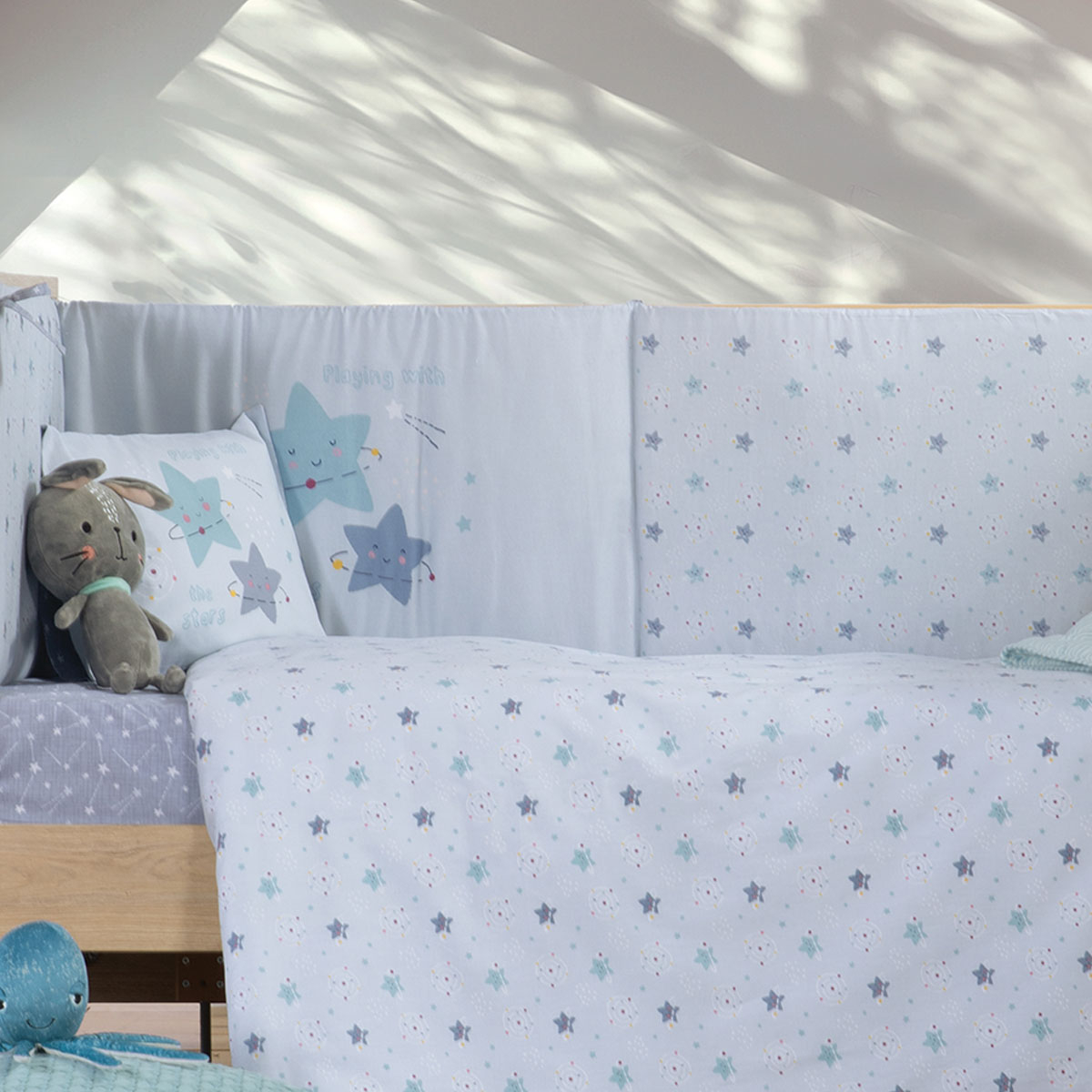 Βρεφική πάντα για την κούνια από την εταιρεία Nef-Nef σε γαλάζιο χρώμα και σχέδιο με αστεράκια. Το εξωτερικό ύφασμα από 100% βαμβάκι 144 κλωστών και η γέμιση από πολυεστερική βάτα. Προστατέψτε το μωρό σας από χτυπήματα στην κούνια με αυτή την βρεφική πάντα. Συνδυάστε την με τα υπόλοιπα είδη της συλλογής για ένα ολοκληρωμένο αποτέλεσμα. Η εταιρεία Nef-Nef διαθέτει πιστοποίηση Oeko-Tex, που εγγυάται ότι τα προϊόντα της είναι απαλλαγμένα από επιβλαβείς χημικές ουσίες.