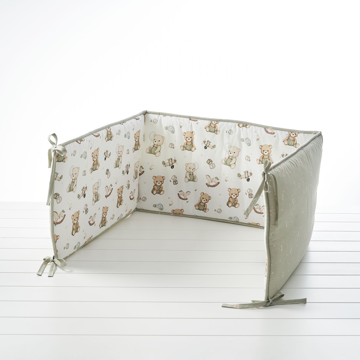 Βρεφική πάντα για την κούνια του μωρού από την εταιρεία Vesta Home σε μπεζ αποχρώσεις, με χακί λεπτομέρειες και σχέδιο παιδικές φιγούρες. Το εξωτερικό ύφασμα είναι από 100% βαμβάκι 144 κλωστών που προσφέρει απαλότητα, ενώ εσωτερικά διαθέτει πολυεστερική βάτα που προστατεύει το μωρό από τυχόν χτυπήματα. Δένει με κορδελάκια στα κάγκελα ή την κουπαστή της κούνιας για σταθερότητα και εύκολη τοποθέτηση. Συνδυάστε την με τα υπόλοιπα είδη της ίδιας σειράς για ένα ολοκληρωμένο αποτέλεσμα.