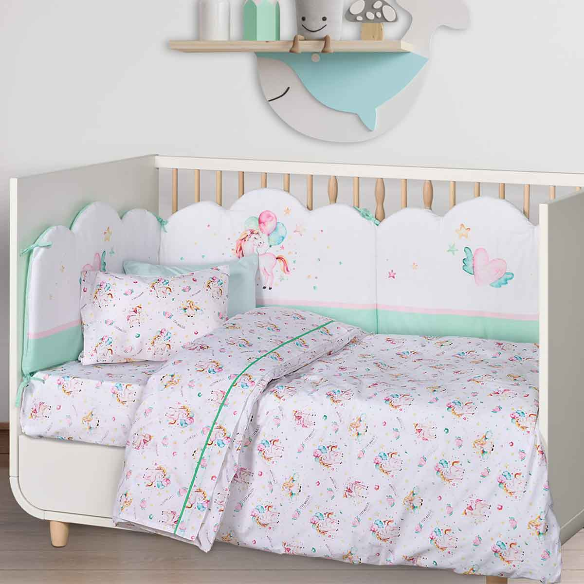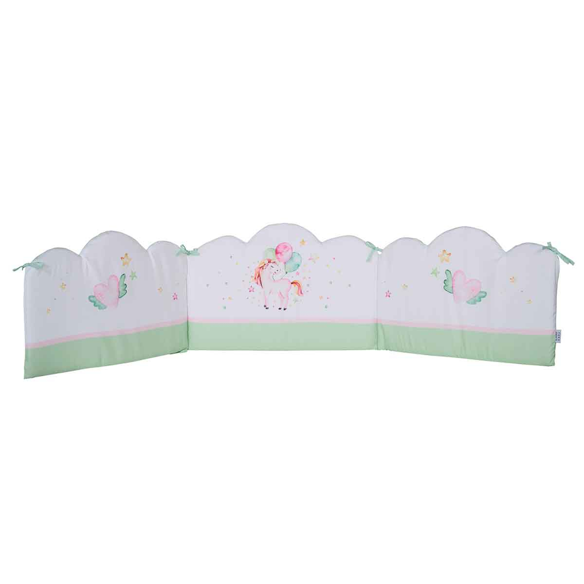 Βρεφική πάντα για την κούνια του μωρού με λευκό φόντο, με πράσινο λεπτομέρειες και σχέδιο μονόκερος από την εταιρεία Das Home. Το εξωτερικό ύφασμα είναι από 100% microfiber που προσφέρει απαλότητα, ενώ εσωτερικά διαθέτει πολυεστερική βάτα που προστατεύει το μωρό από τυχόν χτυπήματα. Δένει με κορδελάκια στα κάγκελα ή την κουπαστή της κούνιας για σταθερότητα και εύκολη τοποθέτηση. Συνδυάστε την με τα υπόλοιπα είδη της ίδιας σειράς για ένα ολοκληρωμένο αποτέλεσμα.