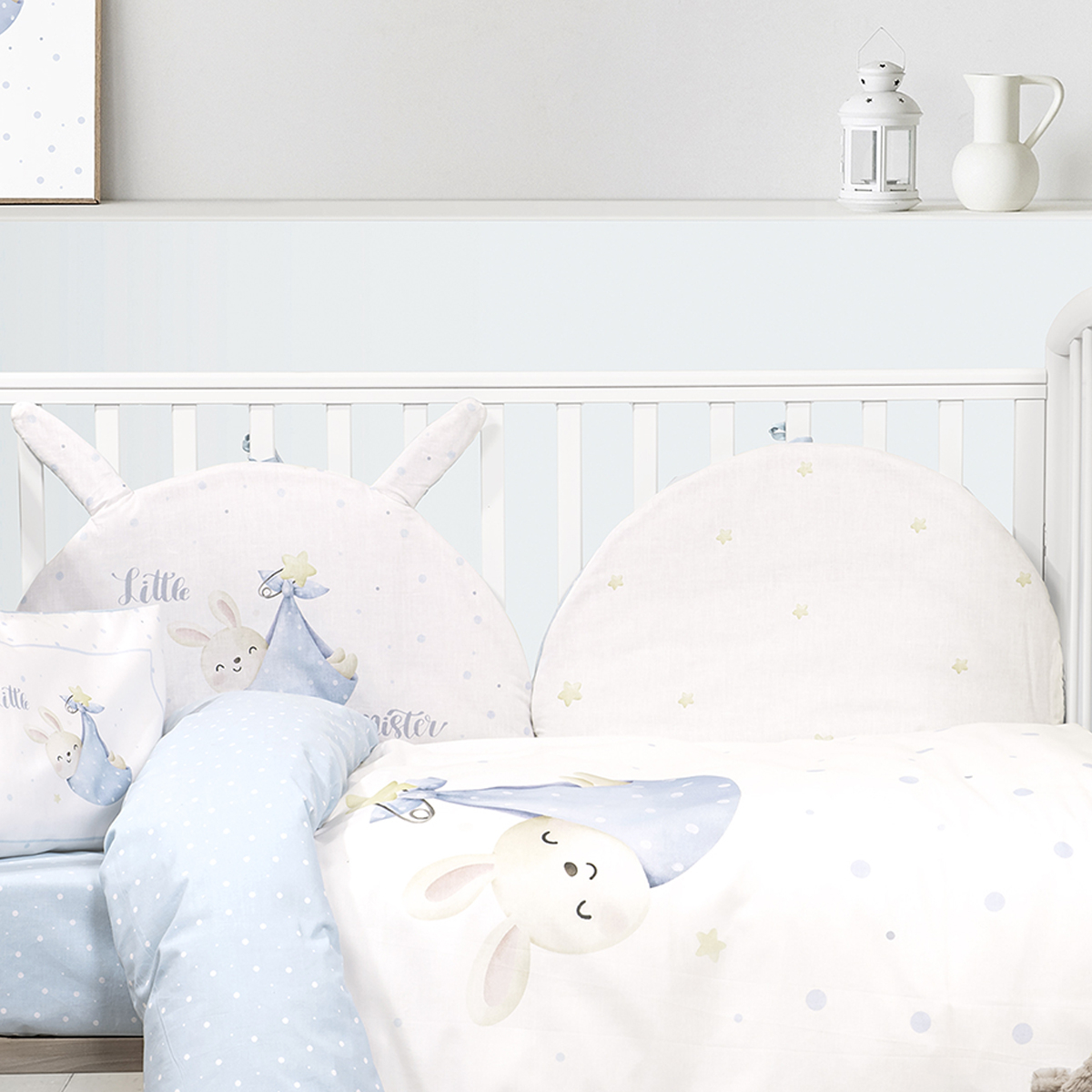 Βρεφική πάντα για την κούνια από την εταιρεία Nima. Σε λευκό φόντο, με γαλάζιες λεπτομέρειες και σχέδιο κουνελάκι. Το εξωτερικό ύφασμα είναι 100% βαμβάκι 144 κλωστών, απαλό και ανθεκτικό. Εσωτερικά διαθέτει πολυεστερική βάτα για προστασία του μωρού από χτυπήματα. Συνδυάστε την με τα υπόλοιπα είδη της ίδιας σειράς για ένα ολοκληρωμένο αποτέλεσμα.