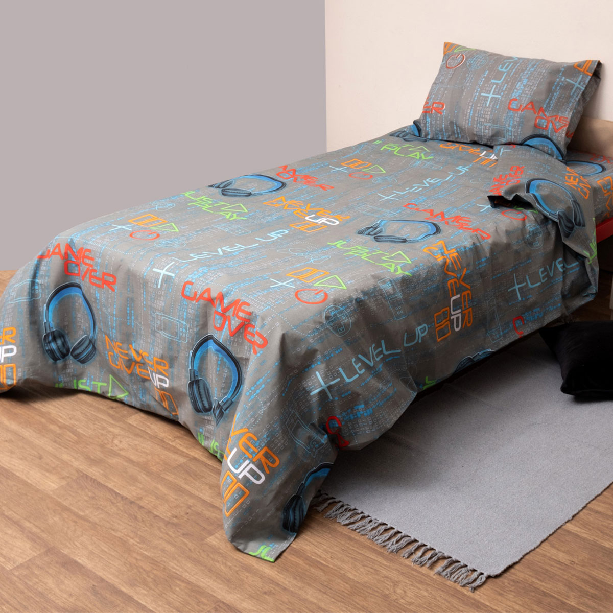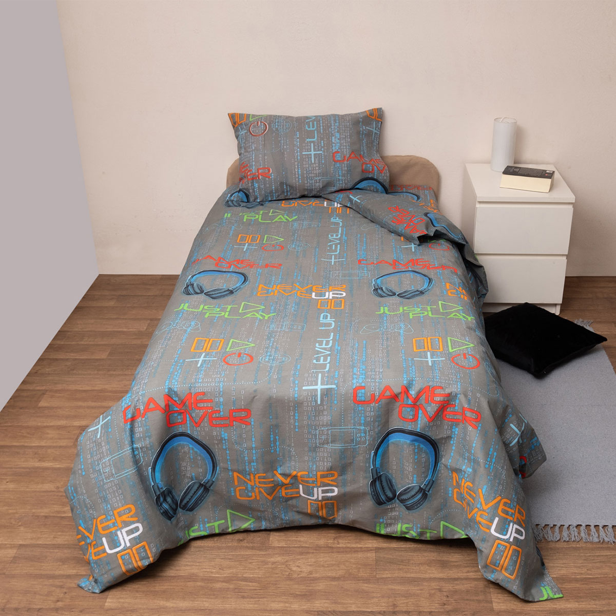 Ημίδιπλο πάπλωμα σε γκρι χρώμα με μοντέρνο σχέδιο και πολύχρωμες αποχρώσεις από την εταιρεία Viopros. Η σύνθεση του εξωτερικού υφάσματος είναι από 60% βαμβάκι 40% polyester που προσφέρει ανθεκτικότητα και απαλότητα ενώ η γέμιση είναι πολυεστερική βάτα. Συνδυάστε την με τα υπόλοιπα είδη της ίδιας σειράς για ένα ολοκληρωμένο αποτέλεσμα.