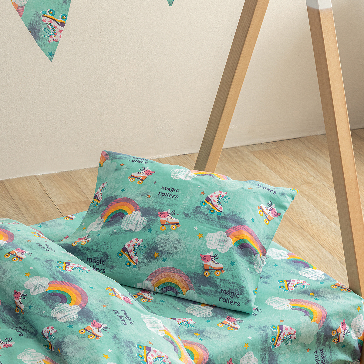 Πάπλωμα για την κούνια του μωρού σε τυρκουάζ χρώμα, με πολύχρωμες λεπτομέρειες και σχέδιο νεράιδες εταιρείας Palamaiki. Το ύφασμα είναι 100% βαμβάκι 144 κλωστών, ενώ εσωτερικά διαθέτει βάτα που το καθιστά ζεστό και ιδανικό για τους χειμερινούς. Συνδυάστε το με τα υπόλοιπα είδη της ίδιας σειράς για ένα ολοκληρωμένο αποτέλεσμα.