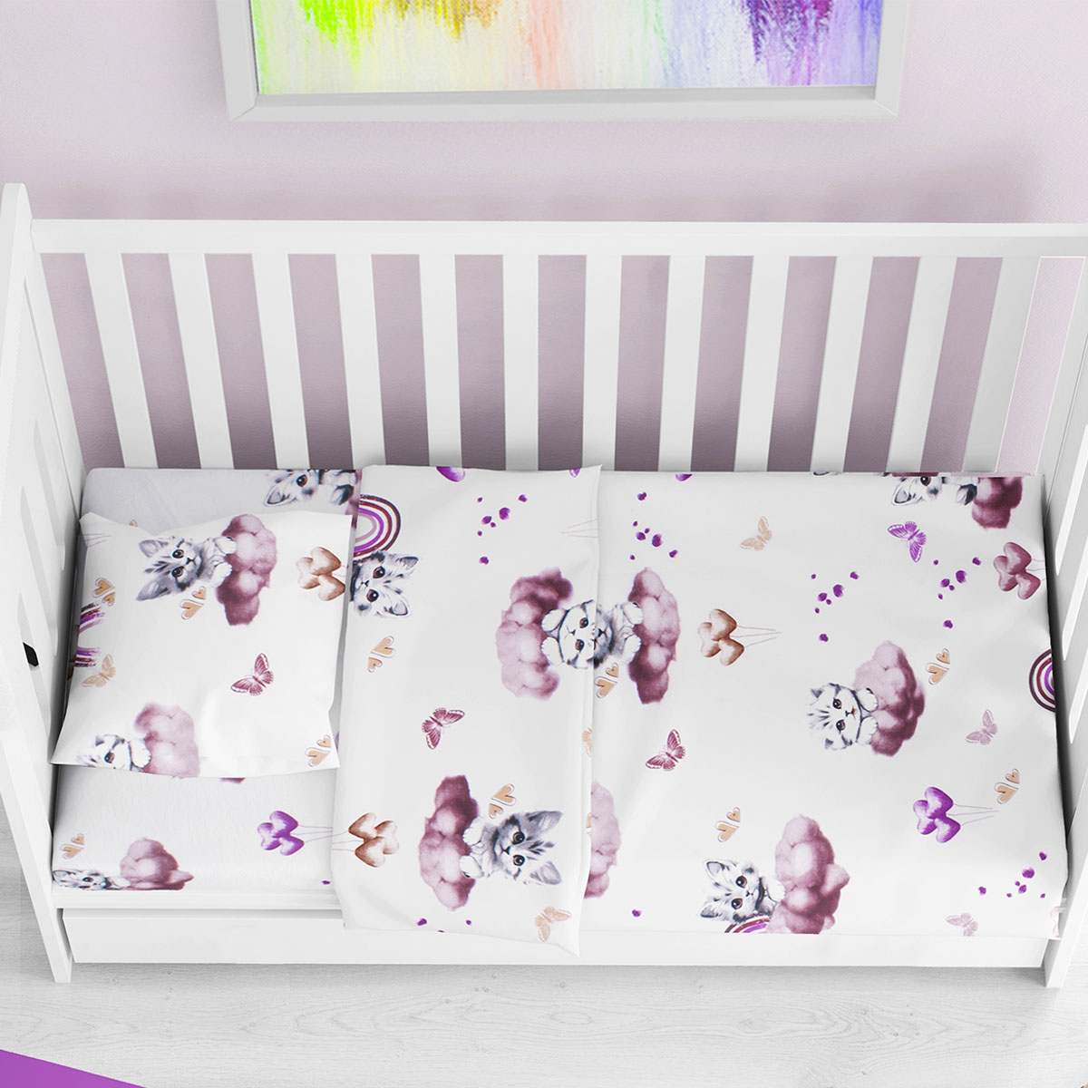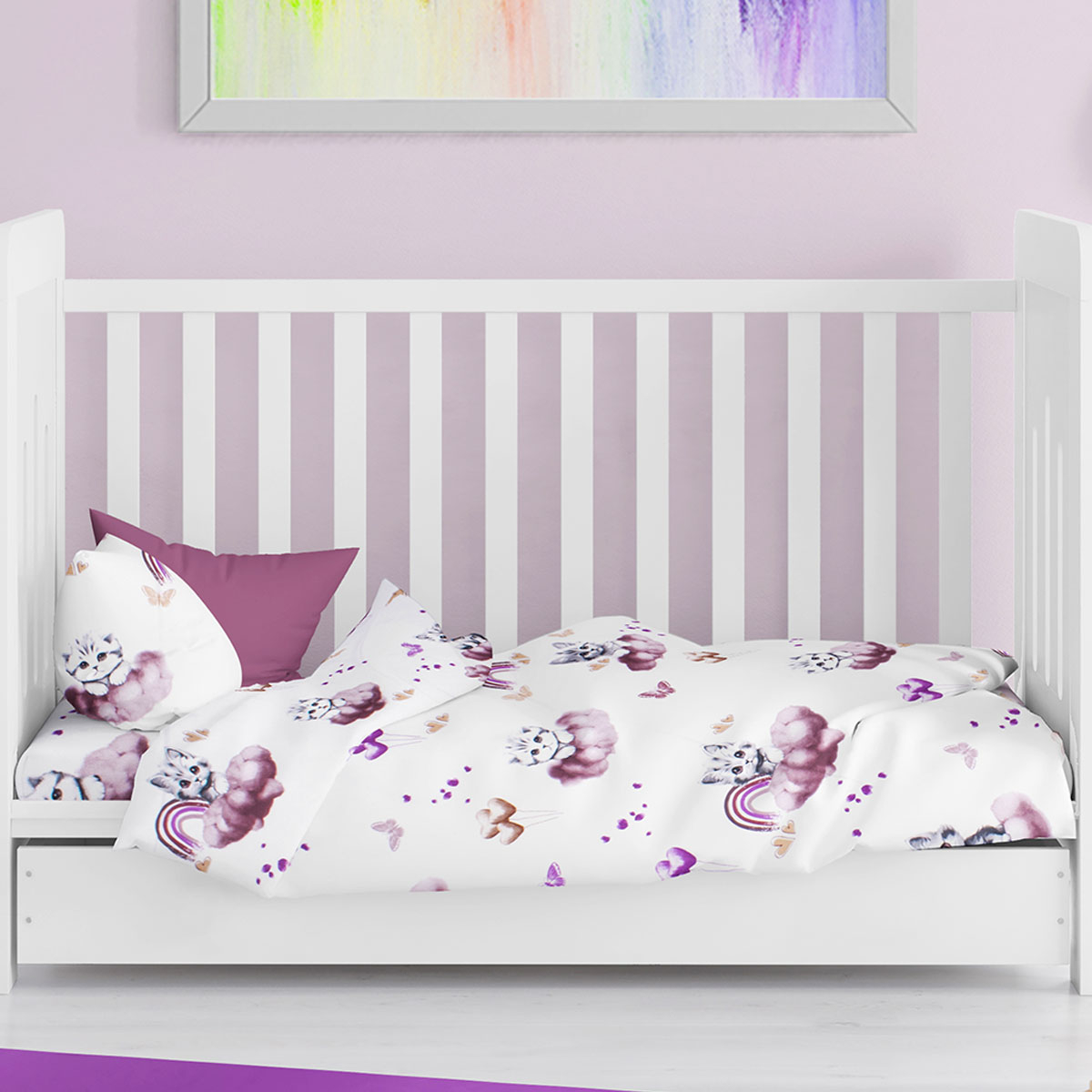 Πάπλωμα για την κούνια του μωρού σας σε λευκό φόντο, με ροζ-μωβ λεπτομέρειες και σχέδιο γατούλα από την εταιρεία Dimcol. Με εξωτερικό ύφασμα από 100% βαμβάκι 144 κλωστών και γέμιση από πολυεστερική αντιαλλεργική βάτα βάρους 300gsm. Ιδανικό χειμερινό σκέπασμα. Συνδυάστε το με τα υπόλοιπα είδη της ίδιας σειράς για ένα ολοκληρωμένο αποτέλεσμα.
