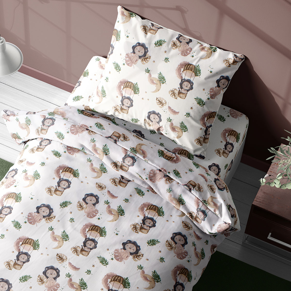 Μονό πάπλωμα σε λευκό χρώμα, με μπεζ-πράσινο λεπτομέρειες και σχέδιο λιοντάρι από την εταιρεία Dimcol. Με εξωτερικό ύφασμα από 100% βαμβάκι 144 κλωστών και γέμιση από πολυεστερική αντιαλλεργική βάτα βάρους 300gsm. Ιδανικό χειμερινό σκέπασμα. Συνδυάστε το με τα υπόλοιπα είδη της ίδιας σειράς για ένα ολοκληρωμένο αποτέλεσμα.