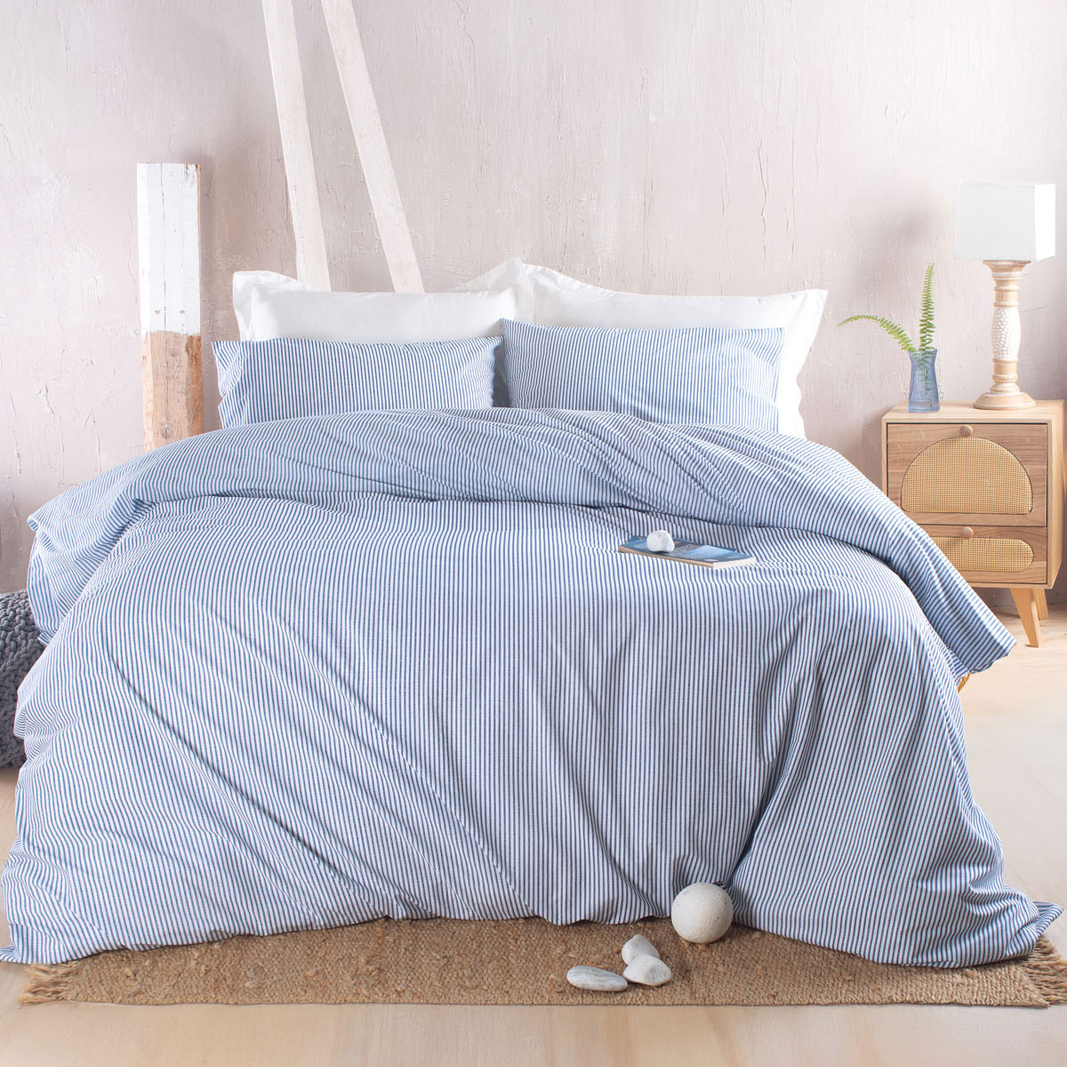 Υπέρδιπλο πάπλωμα σετ από την εταιρεία Rythmos σε μπλε απόχρωση με ριγέ σχέδιο. Είναι κατασκευασμένο από 100% βαμβάκι 144 κλωστών, μαλακό και ανθεκτικό, ενώ η γέμιση είναι από πολυεστερική βάτα βάρους 380gsm. Στο σετ περιλαμβάνονται οι μαξιλαροθήκες φάκελος με το ίδιο σχέδιο. Συνδυάστε το με τα υπόλοιπα προϊόντα της ίδιας συλλογής για ένα αρμονικό αποτέλεσμα.