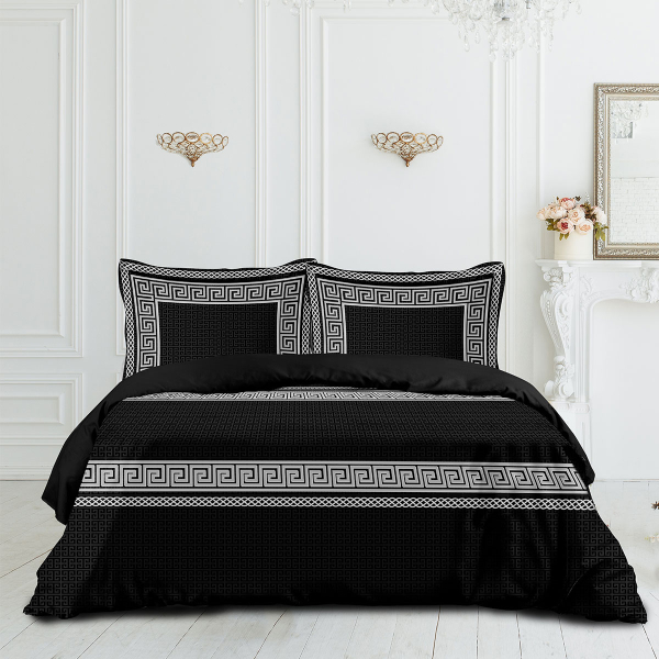 Πάπλωμα υπέρδιπλο σετ από την εταιρεία Makis Tselios. Η εξωτερική του σύνθεση είναι από 100% βαμβακοσατέν 230 κλωστών που το καθιστά ιδιαίτερα απαλό και με μεγάλη αντοχή ενώ η γέμιση από πολυεστερική βάτα. Στο σετ περιλαμβάνονται 2 μαξιλαροθήκες oxford με το ίδιο σχέδιο. Η πάνω πλευρά είναι μαύρη με γκρι γεωμετρικό σχέδιο και η κάτω πλευρά είναι μονόχρωμη μαύρη. Συνδυάστε το με τα υπόλοιπα προϊόντα της ίδιας σειράς για ένα ολοκληρωμένο αποτέλεσμα στον χώρο σας.