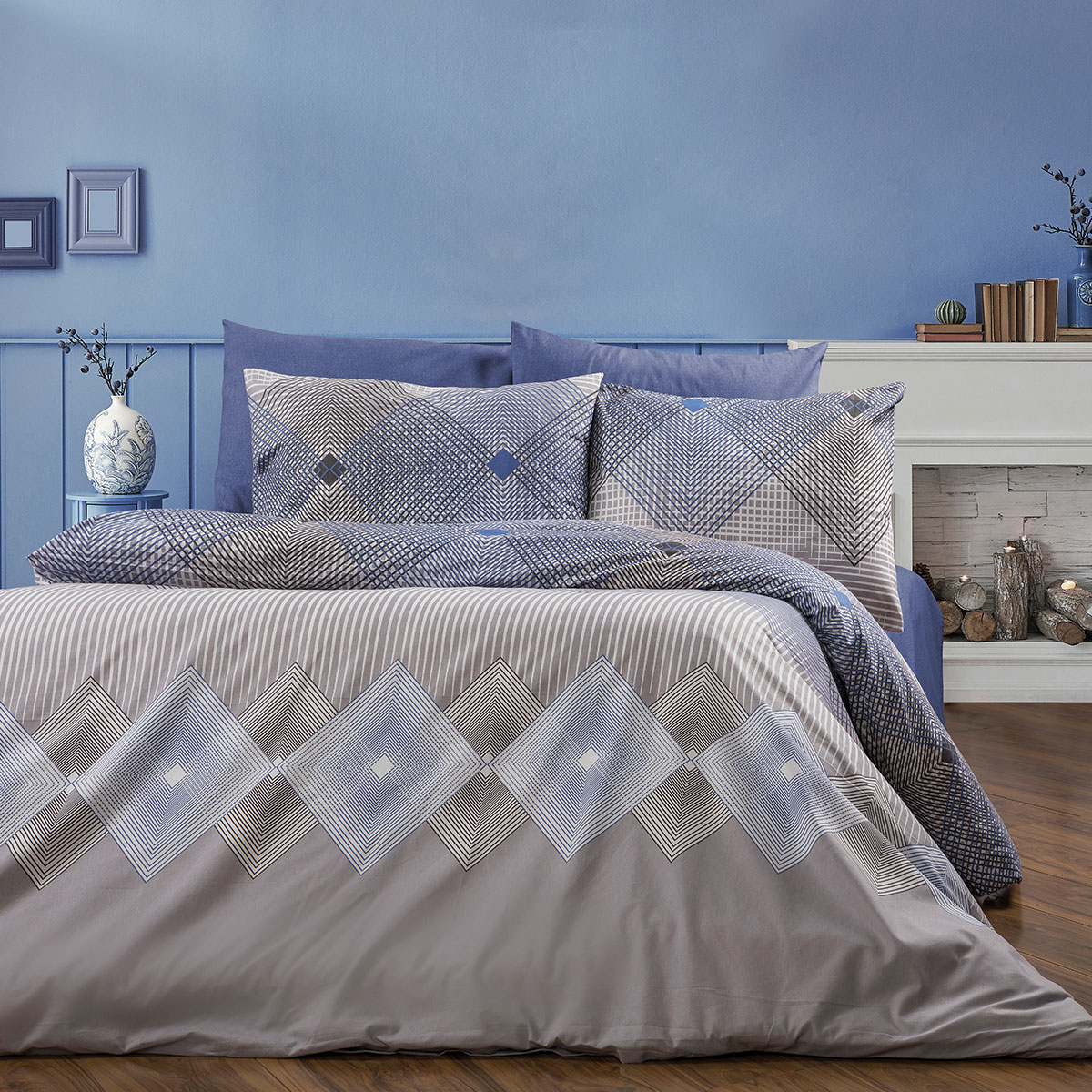 Πάπλωμα υπέρδιπλο από την εταιρεία Dimcol σε γκρι χρώμα με μπλε λεπτομέρειες και γεωμετρικό σχέδιο. Είναι κατασκευασμένο από 70% βαμβάκι και 30% polyester 144 κλωστών. Έχει γέμιση από πολυεστερική αντιαλλεργική βάτα βάρους 300gsm. Συσκευασία Polybag με φερμουάρ και χερούλι. Ελληνικής κατασκευής. Συνδυάστε το με τα υπόλοιπα είδη της ίδιας σειράς για ένα ολοκληρωμένο σετ.