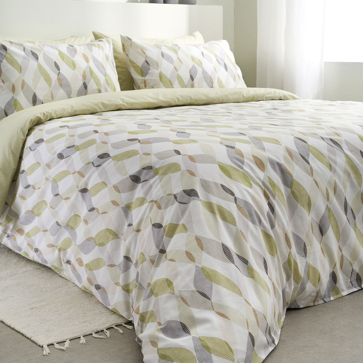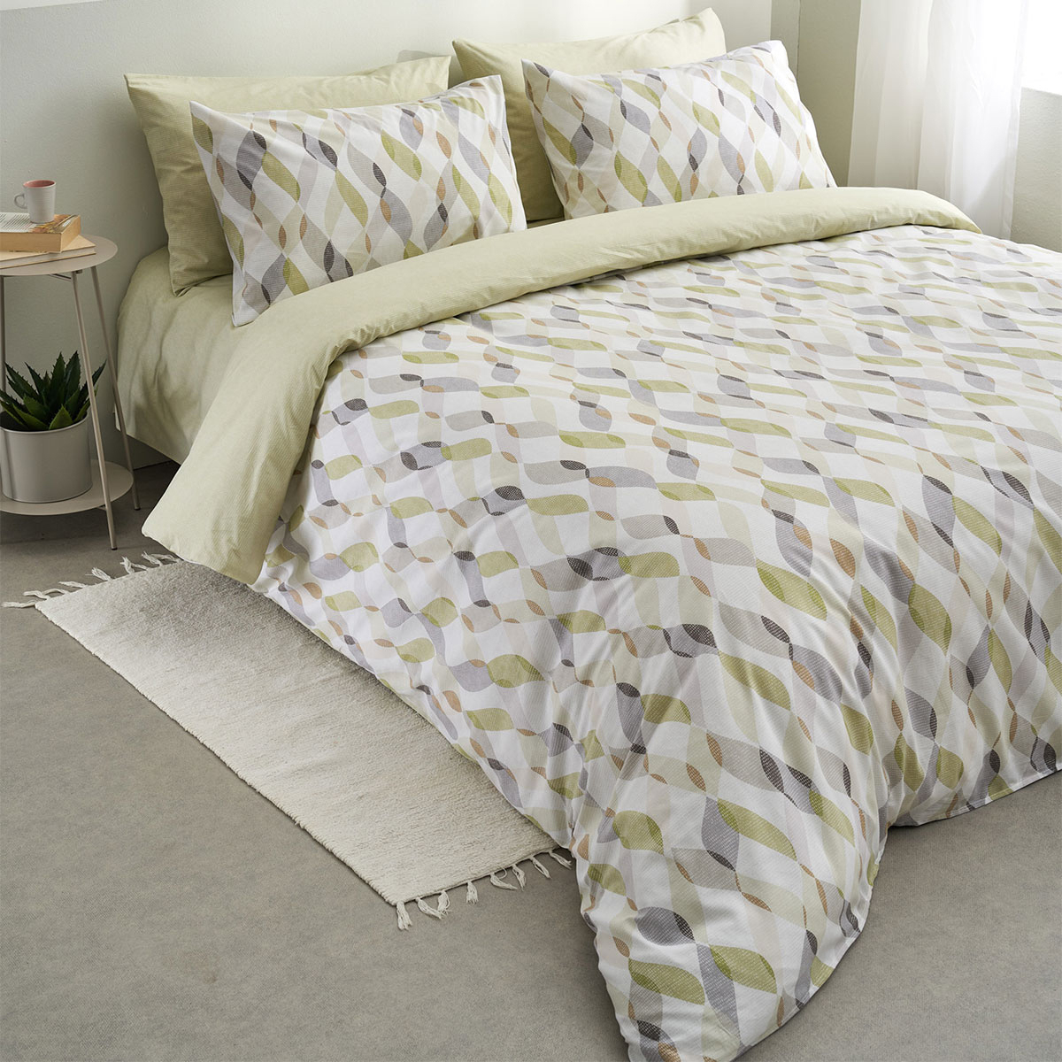 Υπέρδιπλο πάπλωμα από την εταιρεία Vesta Home. Είναι διπλής όψης με την μια μεριά σε εκρού φόντο, με λεπτομέρειες σε πράσινο χρώμα και μοντέρνο σχέδιο, ενώ από την άλλη σε πράσινο χρώμα και μοντέρνο σχέδιο. Το εξωτερικό ύφασμα είναι 100% βαμβάκι 144 κλωστών, απαλό και ανθεκτικό. Εσωτερικά έχει σιλικονούχο πολυεστερική βάτα που προσφέρει ζεστασιά και το καθιστά ιδανικό για τους χειμερινούς μήνες. Συνδυάστε το με τα υπόλοιπα προϊόντα του ίδιου σχεδίου για ένα ολοκληρωμένο αποτέλεσμα.
