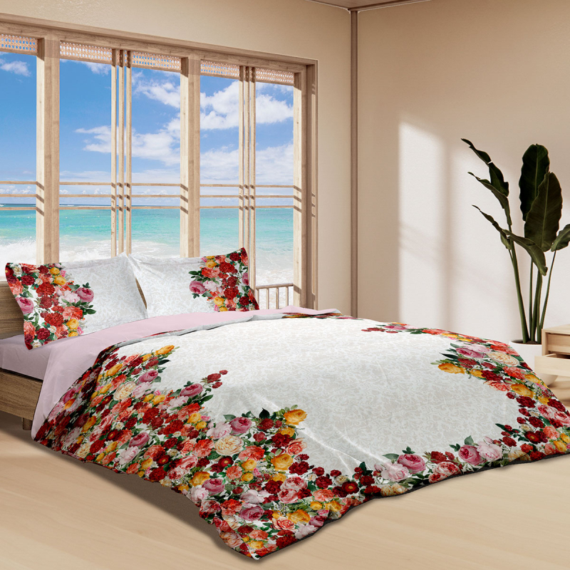 Πάπλωμα γίγας σετ με λευκό φόντο, πολύχρωμες λεπτομέρειες και φλοράλ σχέδιο από την εταιρεία Makis Tselios. Η εξωτερική του σύνθεση από 100% βαμβακοσατέν 240 κλωστών και το γέμισμα από πολυεστερική βάτα, το καθιστά ιδιαίτερα απαλό και με μεγάλη αντοχή ενώ το σχέδιο είναι τυπωμένο με την μέθοδο της ψηφιακής εκτύπωσης. Είναι ιδανικό για τους χειμερινούς μήνες. Στο σετ περιλαμβάνονται και οι μαξιλαροθήκες oxford με το σχέδιο του πανωσέντονου. Συνδυάστε το με τα υπόλοιπα προϊόντα της ίδιας σειράς για ένα ολοκληρωμένο αποτέλεσμα στον χώρο σας.