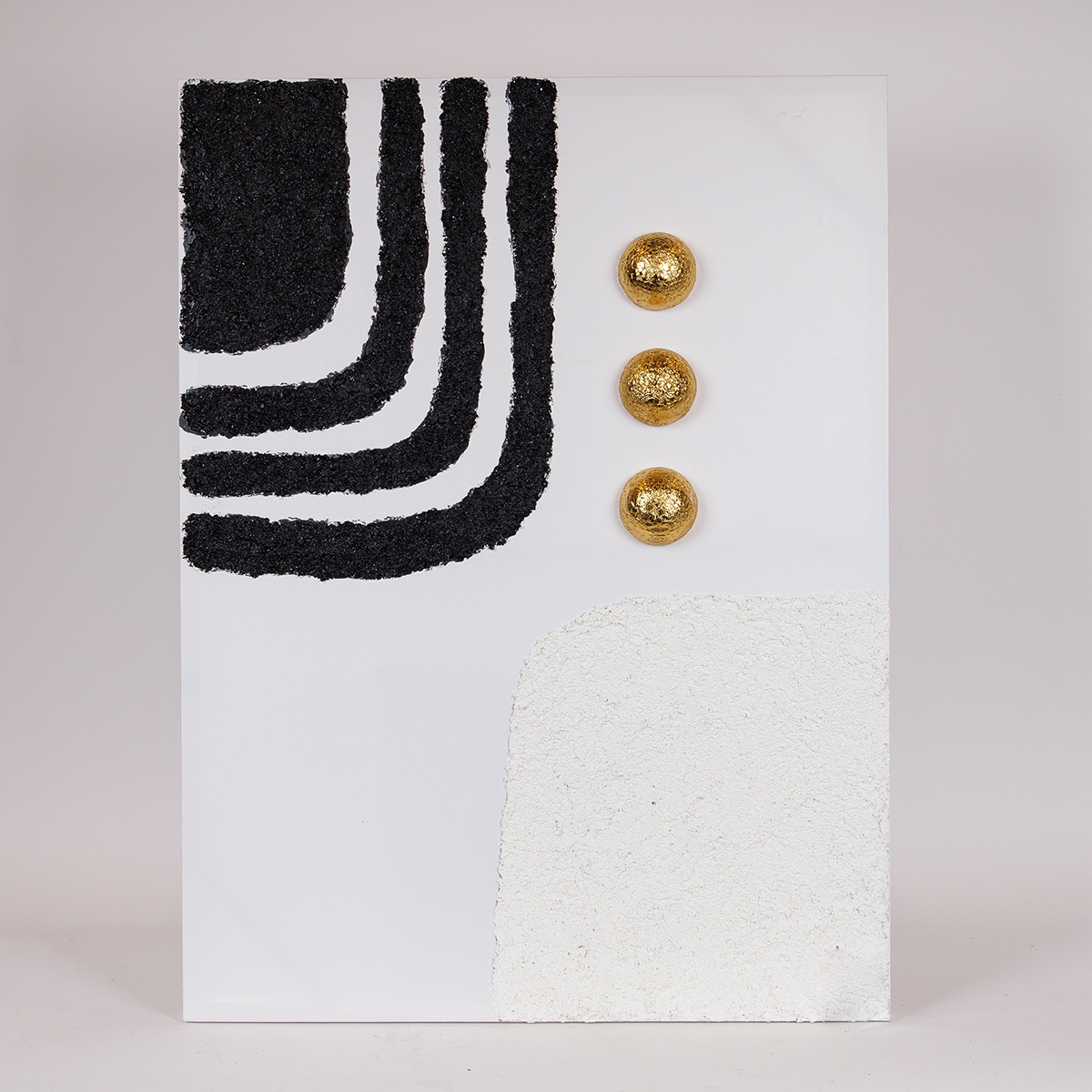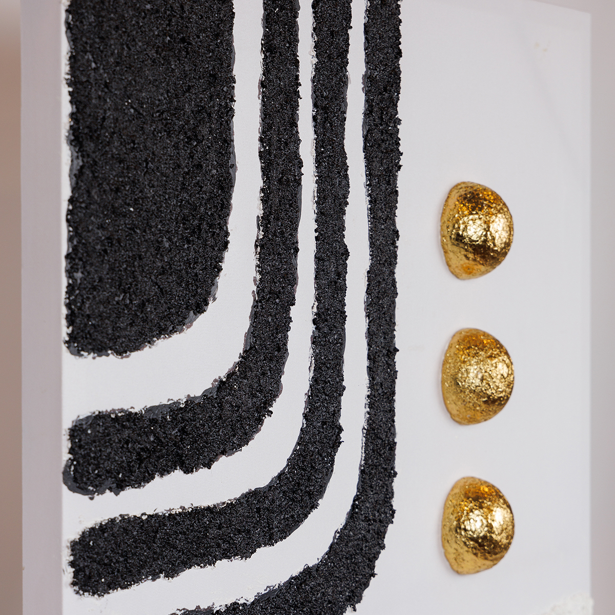 Πίνακας τοίχου από την εταιρεία Estheti σε λευκό φόντο με μαύρο-χρυσό μοντέρνο σχέδιο. Ο καμβάς είναι υφασμάτινος. Έχει ανάγλυφη επιφάνεια χαρίζοντας όγκο, υφή και μια τρισδιάστατη όψη. Ιδανικός για να διακοσμήσει μοναδικά όποιο τοίχο του σπιτιού σας επιθυμείτε. Τοποθετήστε τον σε ένα κενό τοίχο του σπιτιού σας και γεμίστε τον ζωντάνια.