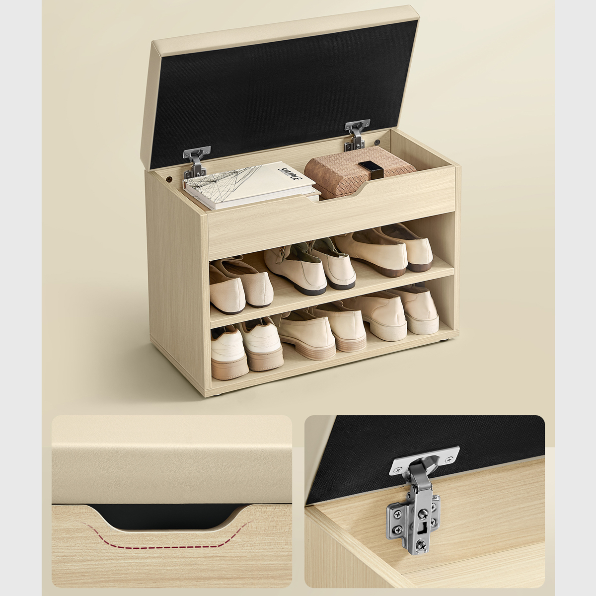 Παγκάκι εισόδου το οποίο λειτουργεί και ως παπουτσοθήκη από την εταιρεία Vasagle. Είναι κατασκευασμένη από μοριοσανίδα και ξύλο MDF σε μπεζ χρώμα. Διαθέτει μπεζ κάθισμα από δερματίνη που εσωτερικά έχει γέμιση από πολυεστερική βάτα. Η επάνω επιφάνεια είναι ανοιγόμενη και από κάτω διαθέτει αποθηκευτικό χώρο. Στα ράφια μπορείτε να τοποθετήσετε αντικείμενα ή παπούτσια (μέγιστο 3 ζευγάρια παπούτσια ανά ράφι). Συνολικό βάρος αντοχής 136kg. *Το προϊόν έρχεται αμοντάριστο και συναρμολογείται βάσει οδηγιών.*