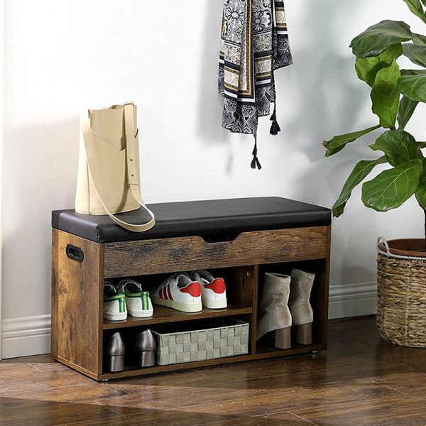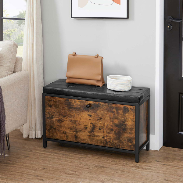 Παγκάκι εισόδου το οποίο λειτουργεί και ως παπουτσοθήκη σε καφέ απόχρωση από την εταιρεία Vasagle. Κατασκευασμένο από μεταλλικό υλικό και μοριοσανίδα. Η επάνω πλευρά διαθέτει υφασμάτινο κάθισμα από απομίμηση δέρματος με εσωτερική επένδυση από σφουγγάρι, για να κάθεστε άνετα όταν βάζετε ή βγάζετε τα παπούτσια σας. Διαθέτει επιπλέον και αποθηκευτικό χώρο κάτω από το κάθισμα, για να τοποθετείτε διάφορα αντικείμενα (μέγιστο επιτρεπόμενο βάρος: 20kg). *Το προϊόν έρχεται αμοντάριστο.*