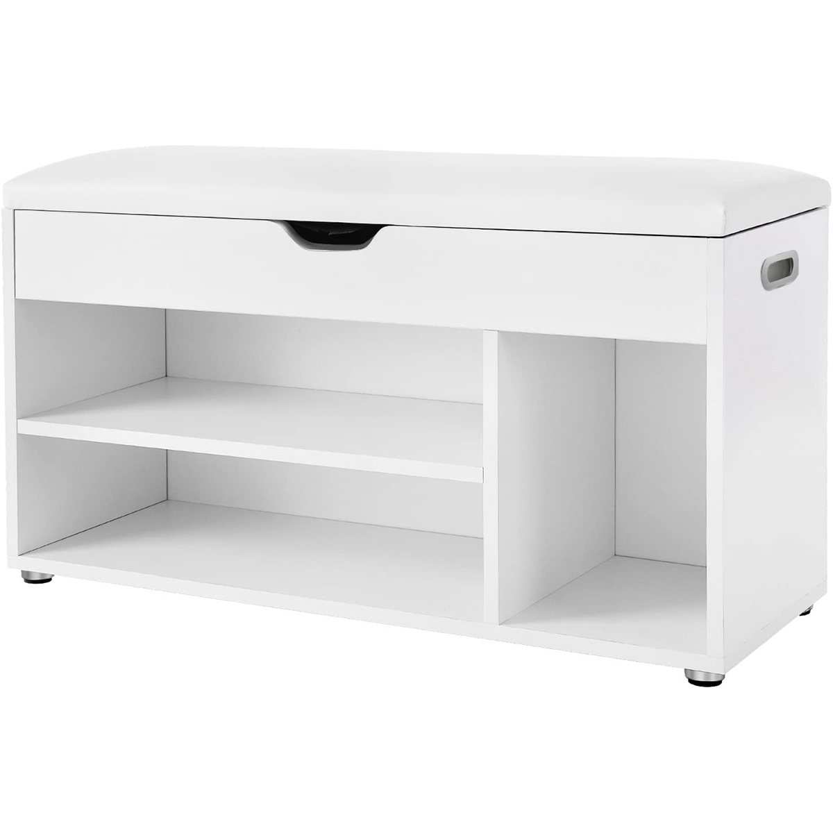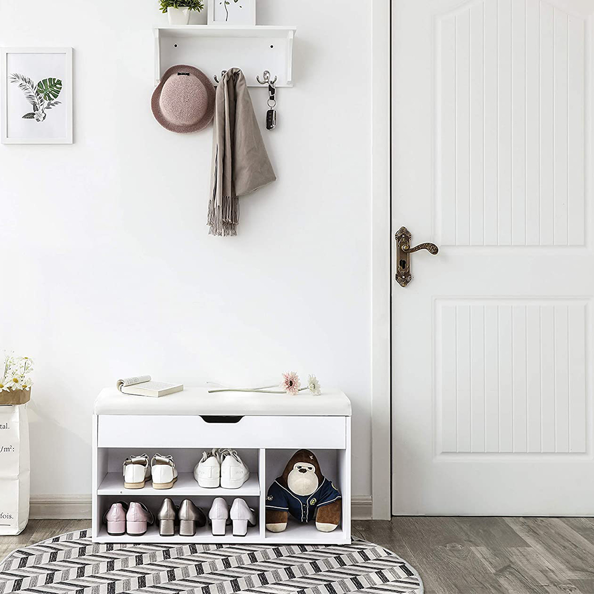 Παγκάκι εισόδου το οποίο λειτουργεί και ως παπουτσοθήκη σε λευκό χρώμα από την εταιρεία Vasagle. Είναι κατασκευασμένο από μοριοσανίδα. Αποτελείται από 2 ράφια με απόσταση μεταξύ τους 13εκ., 1 αποθηκευτικό χώρο 27.5εκ.Μx25εκ.Π., 1 συρτάρι 27εκ.Μx77εκ.Πx8εκ.Υ. και ένα υφασμάτινο παγκάκι επενδυμένο με υλικό foam. Διαθέτει μέγιστο βάρος αντοχής 150 kg. Είναι ιδανικό για να στολίσει τον χώρο της εισόδου του σπιτιού σας. *Το προϊόν έρχεται αμοντάριστο.*
