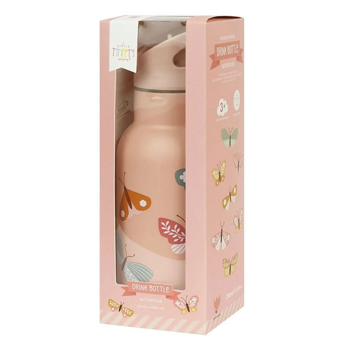 Παγούρι της εταιρείας A Little Lovely Company σε μπεζ χρώμα με πεταλούδες στο σχέδιο. Έχει διπλό τοίχωμα ανοξείδωτου ατσάλι που διατηρεί τα ροφήματα ζεστά ή δροσερά για περισσότερη ώρα. Δεν είναι κατάλληλο για ζεστά ή βραστά υγρά ή ανθρακούχα ποτά. Το καπάκι έχει αθλητικό στόμιο για εύκολο άνοιγμα και αποφυγή διαρροών, με καλαμάκι εσωτερικά. Μη κατάλληλο για πλυντήριο πιάτων και φούρνο μικροκυμάτων. Κατασκευασμένο από πλαστικό χωρίς BPA, μόλυβδο και φθαλικές ενώσεις. Συνδυάστε το με τα υπόλοιπα είδη του ίδιου σχεδίου για ένα ολοκληρωμένο αποτέλεσμα.