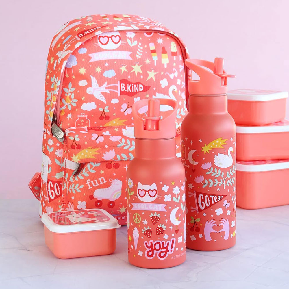 Παγούρι της εταιρείας A Little Lovely Company σε κοραλί χρώμα με μοντέρνο στο σχέδιο. Έχει διπλό τοίχωμα ανοξείδωτου ατσάλι που διατηρεί τα ροφήματα ζεστά ή δροσερά για περισσότερη ώρα. Δεν είναι κατάλληλο για ζεστά ή βραστά υγρά ή ανθρακούχα ποτά. Το καπάκι έχει αθλητικό στόμιο για εύκολο άνοιγμα και αποφυγή διαρροών, με καλαμάκι εσωτερικά. Μη κατάλληλο για πλυντήριο πιάτων και φούρνο μικροκυμάτων. Κατασκευασμένο από πλαστικό χωρίς BPA, μόλυβδο και φθαλικές ενώσεις. Συνδυάστε το με τα υπόλοιπα είδη του ίδιου σχεδίου για ένα ολοκληρωμένο αποτέλεσμα.