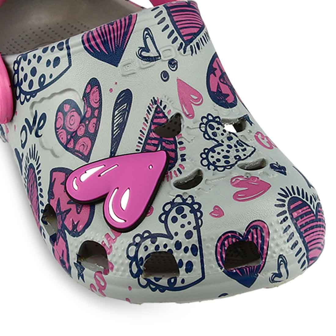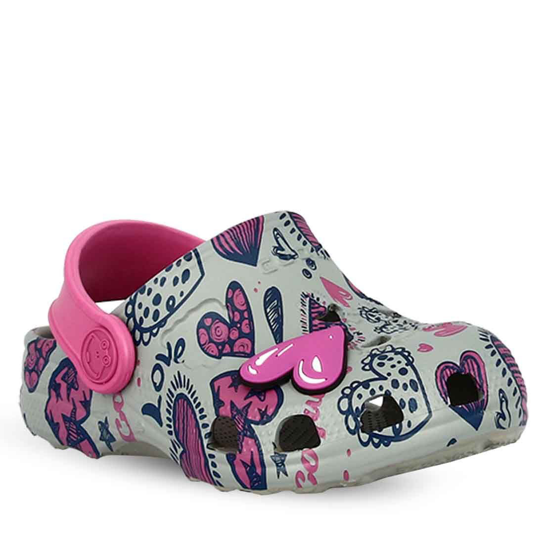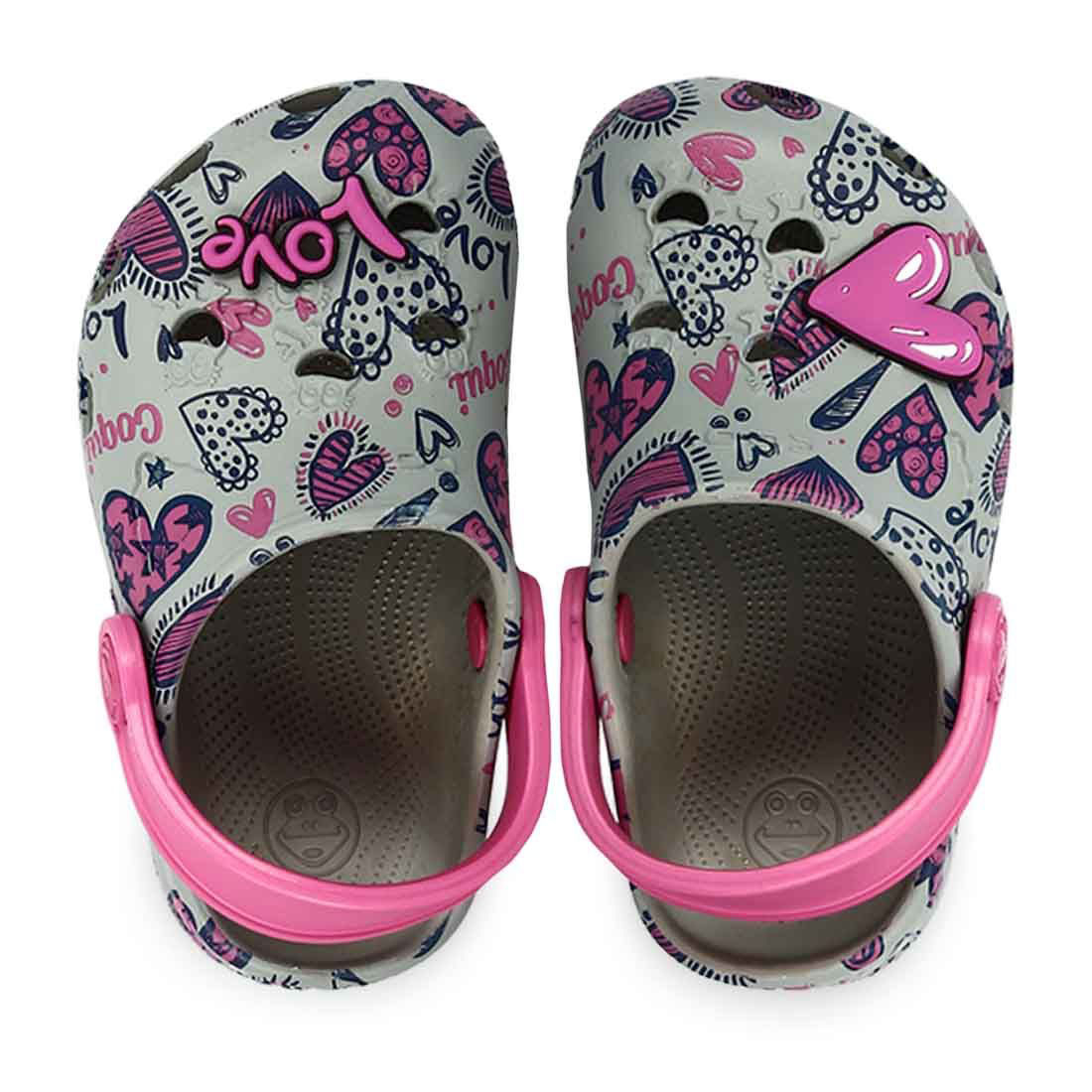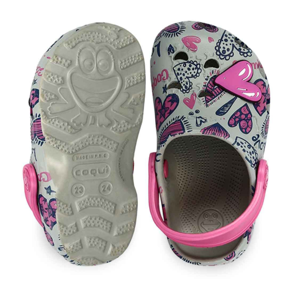Παιδικά αδιάβροχα πέδιλα παραλίας clogs από την εταιρεία Coqui (κωδ.: 11923003) σε γκρι απόχρωση με ροζ λεπτομέρειες. Φέρουν χαριτωμένο σχέδιο με καρδούλες, καθώς και εντυπωσιακή, τρισδιάστατη ροζ καρδιά και επιγραφή Love. Πρόκειται για σαμπό με λουρί στο πίσω μέρος που προσφέρει σε σταθερή εφαρμογή. Το λουρί μπορεί να μετακινηθεί και να τοποθετηθεί στο πάνω μέρος πέδιλου. Είναι κατασκευασμένα από το αφρώδες υλικό EVA, που εξασφαλίζει ελαστικότητα, ευλυγισία και αντοχή. Έχουν τρύπες στο πάνω μέρος και το πλάι για τον σωστό αερισμό του ποδιού και την αποστράγγιση του νερού. Ο εσωτερικός πάτος είναι αρκετά μαλακός για περισσότερη άνεση. Η σόλα τους είναι αντιολισθητική για μεγαλύτερη σταθερότητα. Είναι ιδανικά τόσο για το σπίτι και τη βόλτα, όσο και για ατελείωτες στιγμές στην άμμο και την παραλία. Με την υπογραφή της εταιρείας Parex για άριστη ποιότητα και αξιοπιστία.