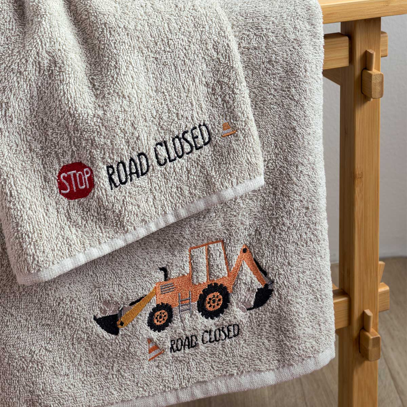 Σετ πετσέτες μπάνιου της εταιρείας Palamaiki σε μπεζ απόχρωση και κέντημα με παιδικό σχέδιο. Η σύνθεσή τους είναι από 100% βαμβάκι βάρους 380gsm, που τις καθιστά απαλές και εύκολες στο στέγνωμα. Σε συσκευασία οικολογικό κουτί δώρου.