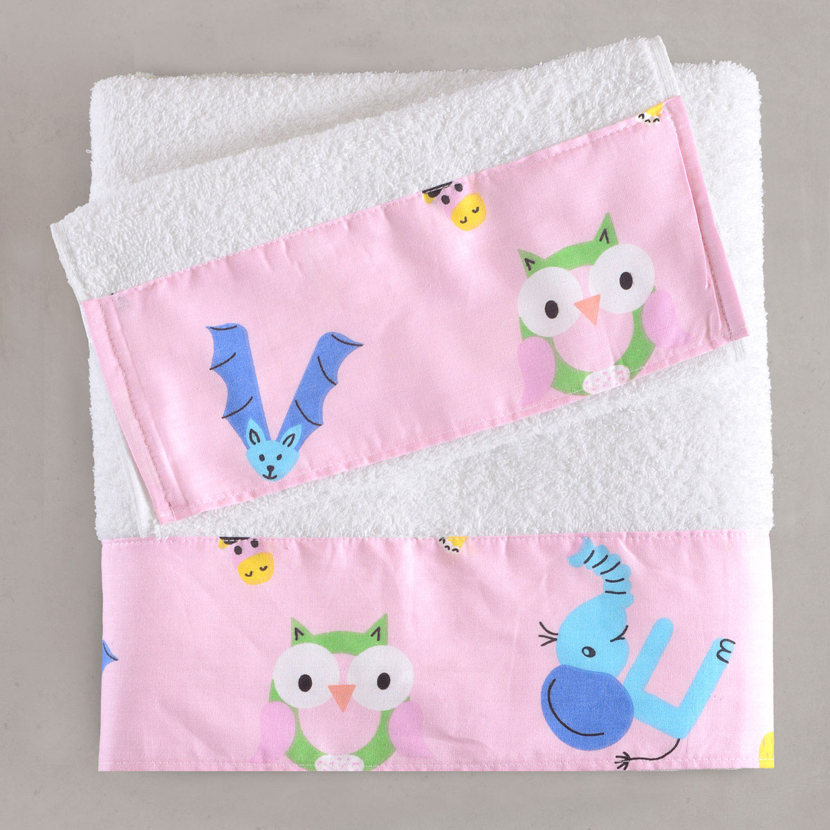 Σετ παιδικές πετσέτες από την εταιρεία Rythmos σε λευκό χρώμα, με υφασμάτινη ροζ φάσα με μοντέρνο σχέδιο. Είναι κατασκευασμένες από 100% βαμβακερό ύφασμα βάρους 500gsm που τις καθιστά ιδιαίτερα απαλές και απορροφητικές.