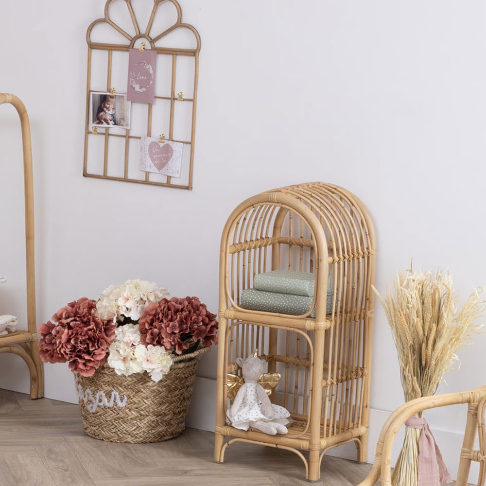 Βιβλιοθήκη με 2 ράφια ιδανική για το βρεφικό και παιδικό δωμάτιο. Είναι κατασκευασμένη από ρατάν σε φυσική απόχρωση με μοντέρνο σχεδιασμό. Μπορείτε να τοποθετήσετε κορνίζες, μικροαντικείμενα, παραμύθια, λούτρινα και ότι άλλο θέλετε να κρατήσετε οργανωμένο. Το προϊόν έρχεται μονταρισμένο.