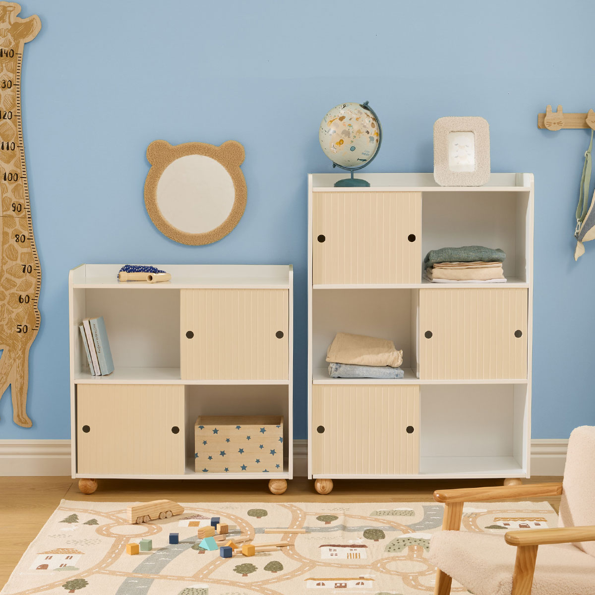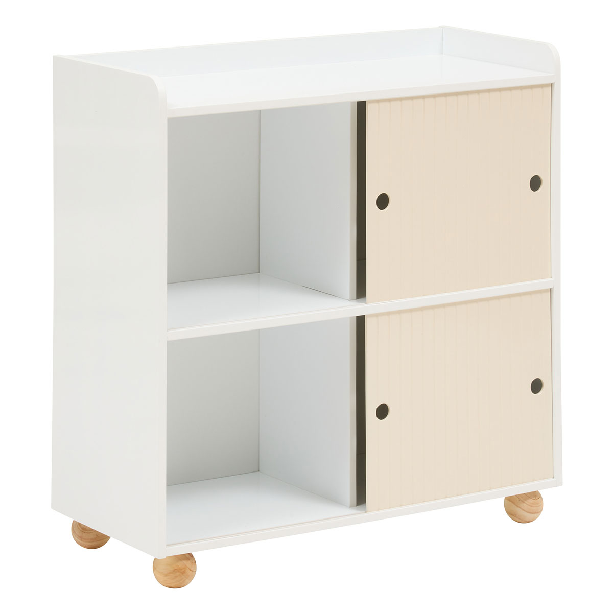 Βιβλιοθήκη ιδανική για το βρεφικό και παιδικό δωμάτιο. Είναι κατασκευασμένη από ξύλο MDF_E1 σε μπεζ και λευκό χρώμα με στρογγυλεμένα ποδαράκια σε φυσική απόχρωση. Διαθέτει 4 ράφια με 2 συρταρωτά πορτάκια όπου μπορείτε να τοποθετήσετε κορνίζες, μικροαντικείμενα, παραμύθια, λούτρινα και ότι άλλο θέλετε να κρατήσετε οργανωμένο. Ξύλο με πιστοποίηση FSC. Συνδυάστε τη με τα υπόλοιπα είδη της ίδιας συλλογής για ένα ολοκληρωμένο αποτέλεσμα. Το προϊόν έρχεται αμοντάριστο και συναρμολογείται βάσει οδηγιών.