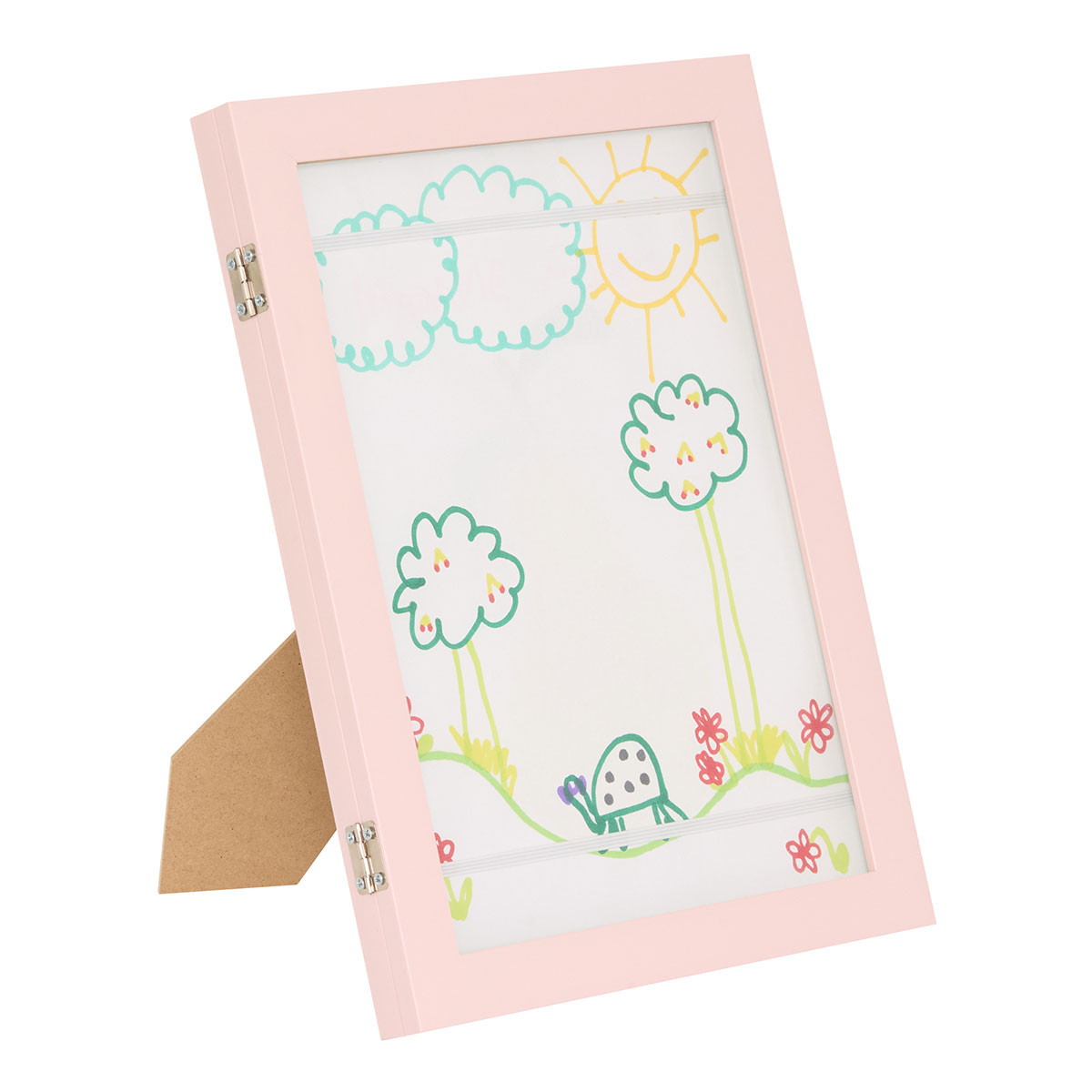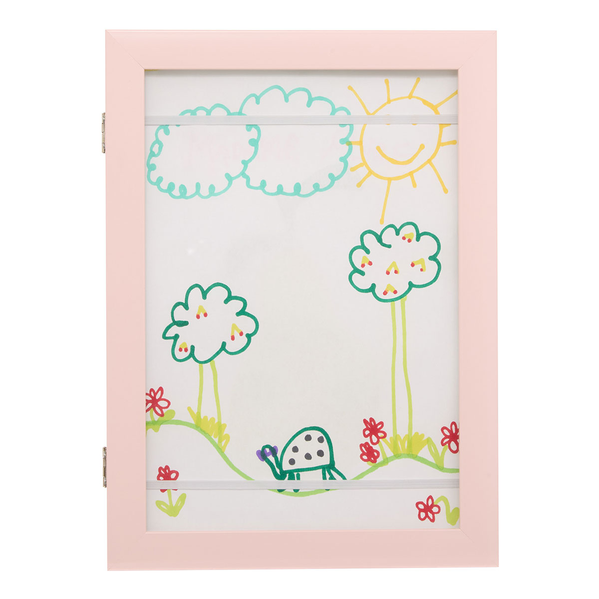 Διακοσμητική κορνίζα για ζωγραφιές ιδανική για το βρεφικό ή παιδικό δωμάτιο. Είναι κατασκευασμένη από ξύλο MDF_E1 σε ροζ χρώμα. Μπορεί να κρεμαστεί στον τοίχο ή να τοποθετηθεί σε κάποιο έπιπλο, κάθετα είτε οριζόντια. Χωράει περισσότερα από 100 σχέδια και διαθέτει 2 λαστιχάκια για να τα συγκρατούν. Έχει μαγνητικό μπροστινό άνοιγμα και είναι ιδανική για να διακοσμήσει το χώρο με τις δημιουργίες του παιδιού σας.