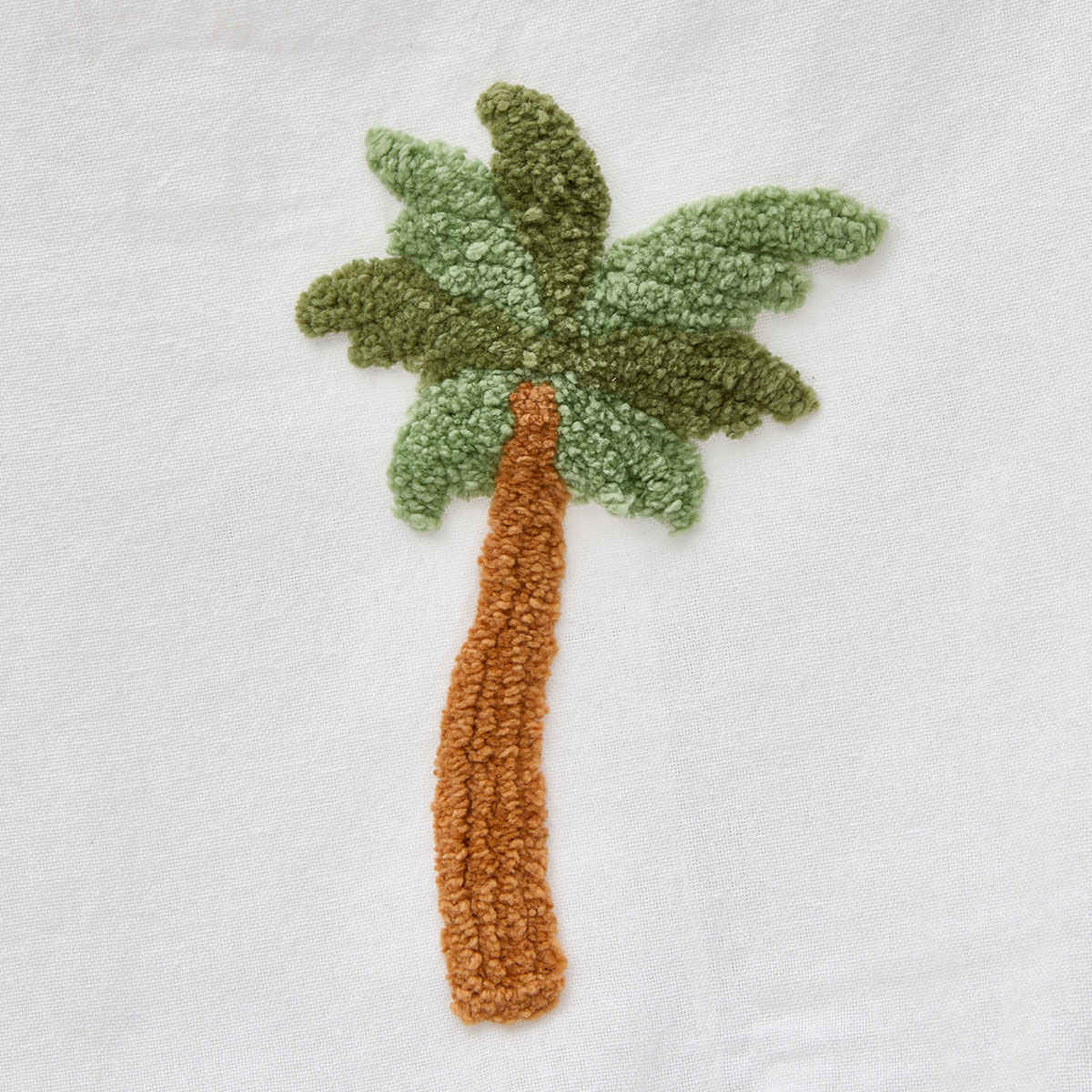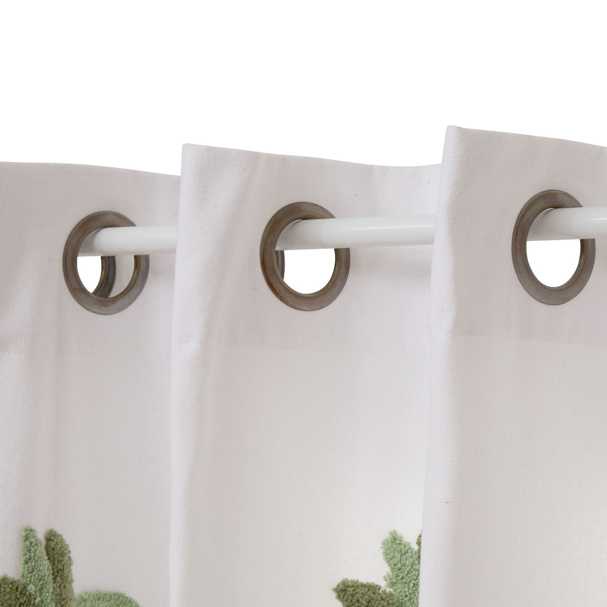 Παιδική κουρτίνα σε λευκό χρώμα με ανάγλυφο σχέδιο με φοίνικες. Το ύφασμα είναι από 100% ανακυκλωμένες ίνες polyester. Είναι μέτριας σκίασης, που επιτρέπει πολύ φως να μπαίνει στο χώρο. Διαθέτει ασημί τρουκς διαμέτρου 4εκ. για εύκολο κρέμασμα. Ιδανική για να ανανεώσει τη διακόσμηση του παιδικού ή βρεφικού δωματίου.