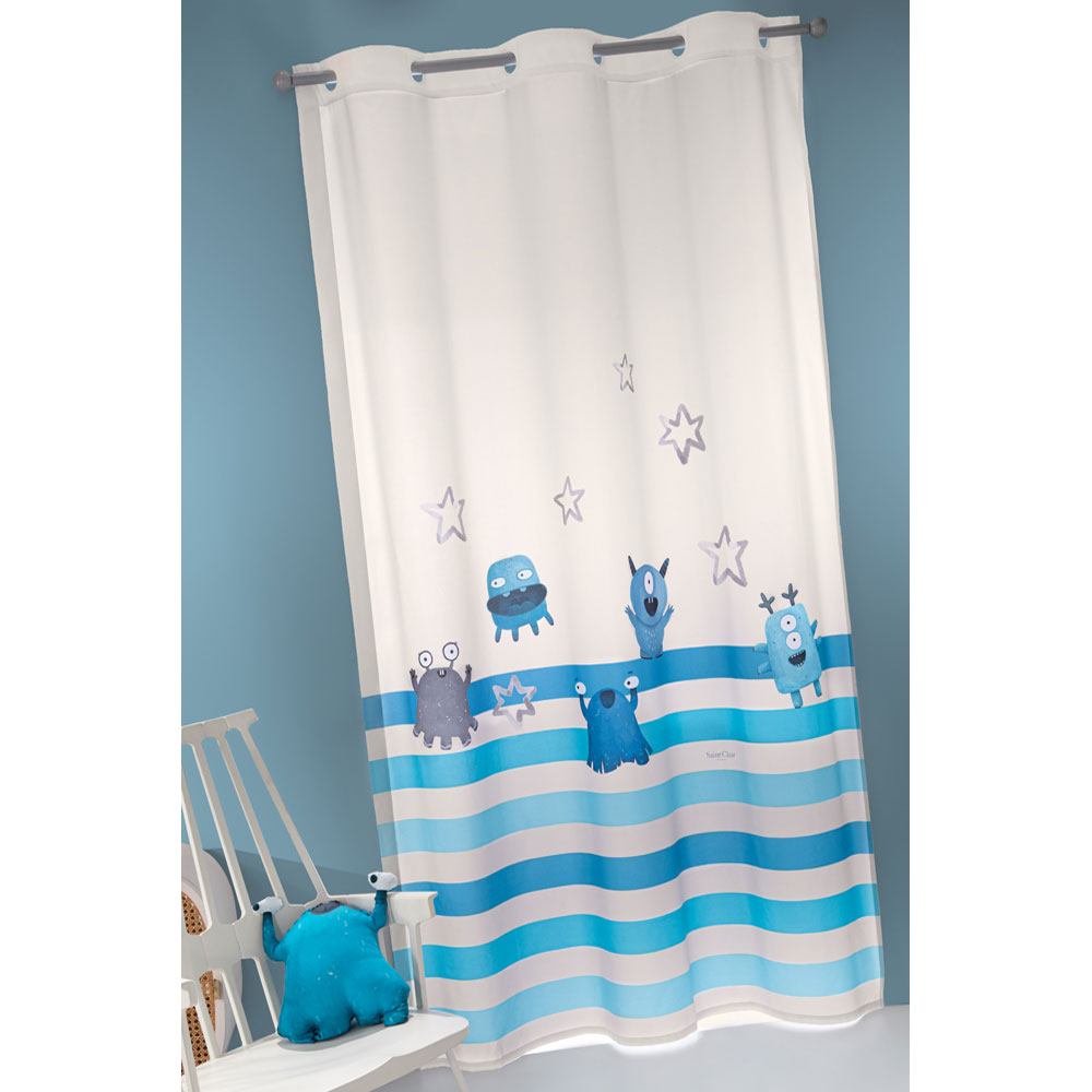 Κουρτίνα παιδικού δωματίου από την εταιρεία Saint Clair, σε λευκό χρώμα με ριγέ μπλε και γαλάζιες λεπτομέρειες και σχέδιο με τερατάκια. Ύφασμα από 100% microsuede μέτριας σκίασης και τρόπος κρεμάσματος με τρουκς. Συνδυάστε την με τα υπόλοιπα προϊόντα της ίδιας σειράς για ένα ολοκληρωμένο αποτέλεσμα.