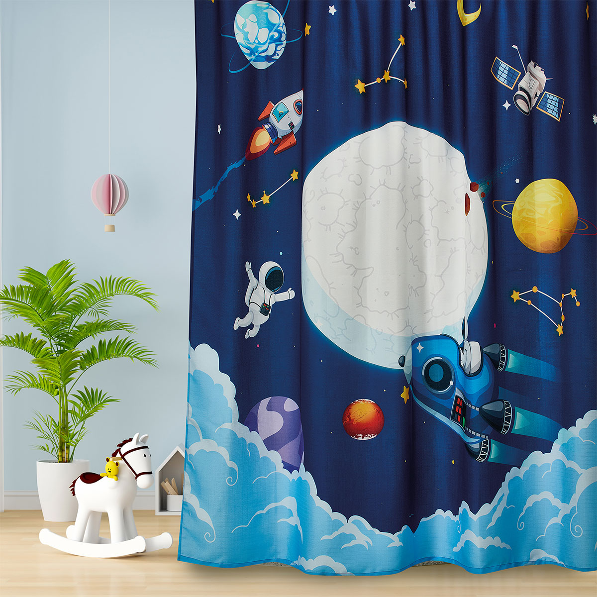 Παιδική κουρτίνα με σχέδιο διαστήματος σε μπλε χρώμα και πολύχρωμες λεπτομέρειες από την εταιρεία Whitegg. Είναι κατασκευασμένη από 100% polyester και έχει τρέσα για να την κρεμάσετε σε σιδηρόδρομο. Το ύφασμα είναι χαμηλής σκίασης.