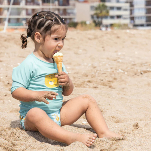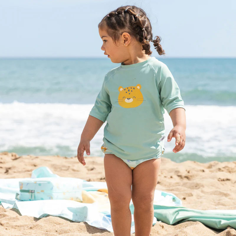 Παιδική μπλούζα με αντηλιακή προστασία από την εταιρεία Saro σε πράσινο χρώμα με ζωάκι στο σχέδιο. Είναι κατασκευασμένο από 85% πολυεστέρα και 15% ελαστάνη που το καθιστά ελαφρύ και αναπνεύσιμο. Έχει προστασία UV UPF 50+. Ιδανικό για την παραλία και την πισίνα. Το ύφασμά του είναι πολύ απαλό και εύκαμπτο. Έχει επίσης υψηλό επίπεδο αντοχής στο χλώριο, ιδανικό για χρήση στην πισίνα. Κατασκευασμένο από υλικό που στεγνώνει πιο γρήγορα από τα κοινά μαγιό. Σύμφωνα με το Ευρωπαϊκό πρότυπο EN 13758-1:2001+A1:2006 και το EN 13758-2:2003+A1:2006.