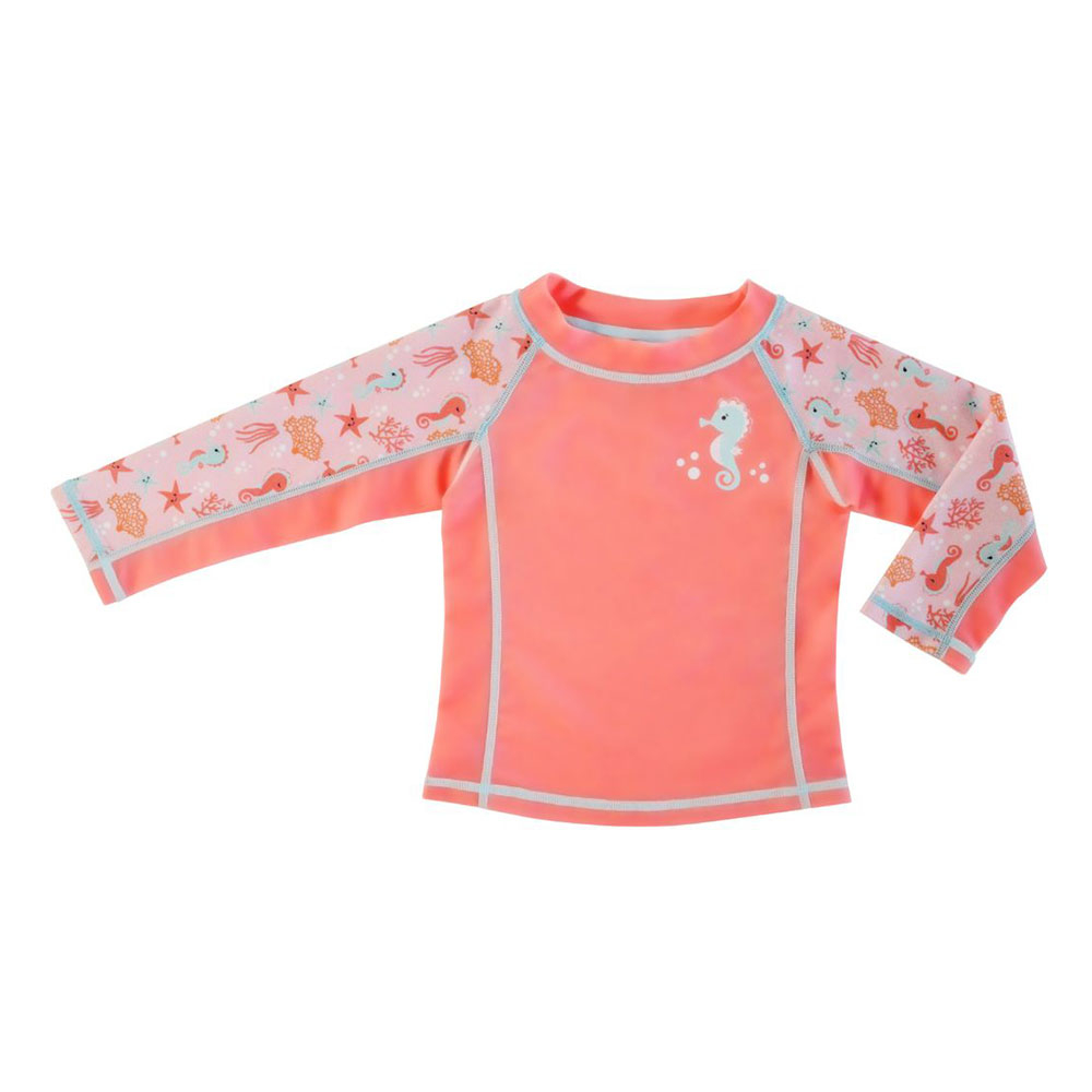 Παιδική μπλούζα θαλάσσης με προστασία UV από την εταιρεία Zoocchini σε σομόν χρώμα με πολύχρωμες λεπτομέρειες και σχέδιο με ιππόκαμπους. Είναι κατασκευασμένη από 85% microfiber polyester και 15% spandex. Απαλλαγμένη από αζοχρώματα και φορμαλδεΰδη, νήματα χωρίς ψευδάργυρο και χημικά. Έχει πιστοποιημένη προστασία UPF50+ που θα προστατεύσει το μικρό σας από τις βλαβερές ακτίνες του ήλιου. Ειδικά σχεδιασμένα για χρήση όλο το χρόνο σε βρεφικές πισίνες, σε νεροτσουλήθρες, σε πισίνες ξενοδοχείου και φυσικά στην παραλία. Αντέχει στο χλώριο και στο αλάτι. Διατηρεί το σχήμα του ακόμη και όταν είναι βρεγμένο. Ο μεγάλος λαιμός διευκολύνει την τοποθέτηση του αλλά και την αφαίρεση του. Διατίθεται σε μέγεθος 6-12 μηνών 68-79εκ. μέγιστου βάρους 7-10 κιλών και περίμετρο στήθους 24εκ. και σε μέγεθος 12-24 μηνών 78-94εκ. μέγιστου βάρους 10-13 κιλών και περίμετρο στήθους 24εκ.