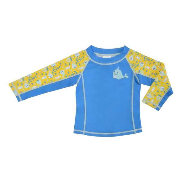 Παιδική μπλούζα θαλάσσης με προστασία UV από την εταιρεία Zoocchini σε μπλε χρώμα με κίτρινες λεπτομέρειες και σχέδιο με φάλαινες. Είναι κατασκευασμένη από 85% microfiber polyester και 15% spandex. Απαλλαγμένη από αζοχρώματα και φορμαλδεΰδη, νήματα χωρίς ψευδάργυρο και χημικά. Έχει πιστοποιημένη προστασία UPF50+ που θα προστατεύσει το μικρό σας από τις βλαβερές ακτίνες του ήλιου. Ειδικά σχεδιασμένα για χρήση όλο το χρόνο σε βρεφικές πισίνες, σε νεροτσουλήθρες, σε πισίνες ξενοδοχείου και φυσικά στην παραλία. Αντέχει στο χλώριο και στο αλάτι. Διατηρεί το σχήμα του ακόμη και όταν είναι βρεγμένο. Ο μεγάλος λαιμός διευκολύνει την τοποθέτηση του αλλά και την αφαίρεση του. Διατίθεται σε μέγεθος 6-12 μηνών 68-79εκ. μέγιστου βάρους 7-10 κιλών και περίμετρο στήθους 24εκ. και σε μέγεθος 12-24 μηνών 78-94εκ. μέγιστου βάρους 10-13 κιλών και περίμετρο στήθους 24εκ.